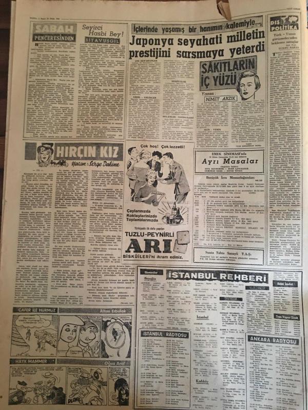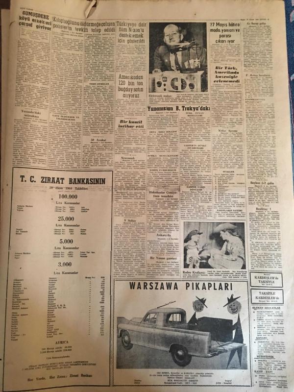 YENİ SABAH GAZETESİ 23 EKİM 1960 YIL :23 SAYI :7765--Bugün bütün yurt da nüfus sayımı yapılıyor --Kılıçlıoğlunu öldürmek isteyen polislerin tevkifi talep edildi --50 Avukat dün adada sakıtlarda görüştü --Yunanistan B.Trakya da ki Türkler için teminat verdi --9 Subay hadisesi tekrar ele alındı --Bir Yunan gazetesi 6-7 Eylül için ilk işareti Fatih R.Zorlu vermiştir diyor ---Seyirci Hasbi Bey :Siyavuşgil --İstanbul Rehberi ---Üç günlük çıkarma programı yedi saat içinde tamamlandı --Çiftçi borçlarının faiz haddi yüzde beş indirilecek ---Tiyatro :Neler gördük ? Neler göreceğiz?--Fenerbahçe ,Beşiktaş berabere ,Galatasaray galip --Beşiktaş beraberlik golünü yine son dakikalarda atı :1-1--Denk kuvvetler mücadelesinde Beykoz Kasımpaşa ya 3-2 galip ---İstanbulspor nihayet A.Gücünden puan aldı --- adlı eser, Kitap > Süreli Yayınlar > Gazeteler > Türkiye > Genel > Günlük kategorisinde İkinci El olarak satıştadır.