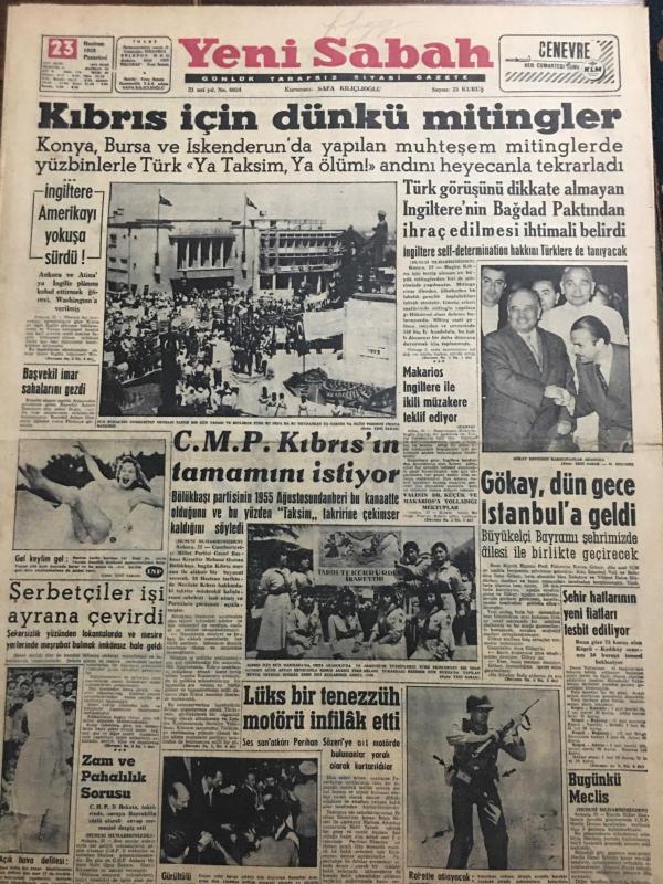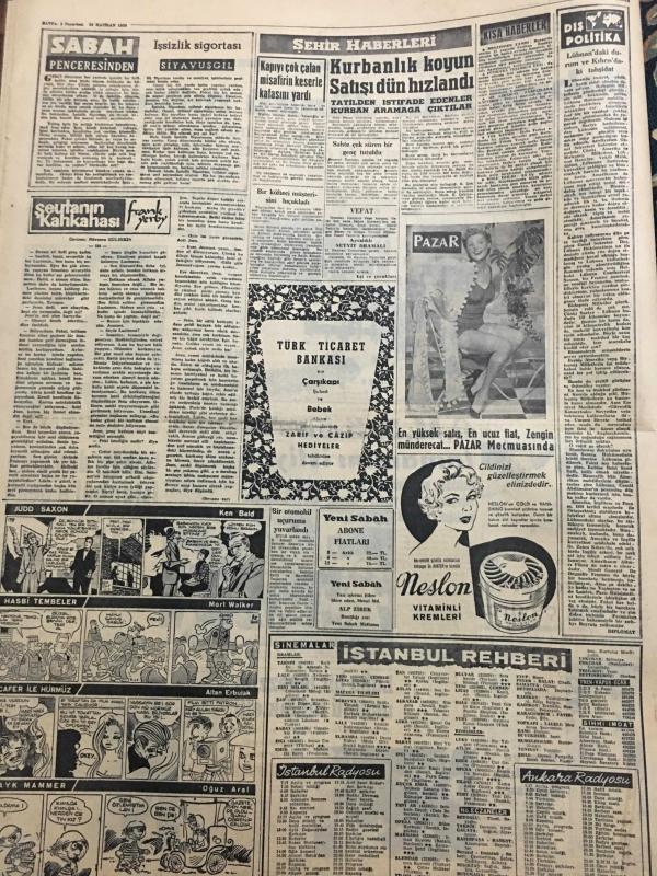 YENİ SABAH GAZETESİ 23 HAZİRAN 1958 YIL :21 SAYI :6934--Kıbrıs için dünkü mitingler ---İngiltere Amerika yı yokuşa sürdü ---CMP Kıbrıs ın tamamını istiyor---Türk görüşünü dikkate almayan İngiltere nin Bağdat Paktından ihraç edilmesi ihtimali belirdi ---Gökay ,dün gece İstanbul a geldi --Lüks bir tenezzüh motorü infilak etti ---Zam ve pahalılık sorusu ---İşsizlik sigortası :Siyavuşgil ---İstanbul Rehberi ---Amerika ,Lübnan a kuvvet göndermiyor --B.Milletlerde Nagy nin idamı takbih edildi --CHP nin dünkü ilçe kongreleri ---Sanayicilerin kalkınmasını temin edecek bir teşebbüs ---Dünya Kupası nda 2. olduk 38 puanla Rusya şampiyon ---Galatasaray ,Güneş i mağlup etti :2-1--Beşiktaş ,Beykoz u farklı yendi :4-1---Fenerbahçe rövanşta da Vefa ya yenildi :1-0--Makarios İngiltere ile ikili müzakere teklif ediyor ---Şehir hatlarının yeni fiyatları tespit edildi ---Bugünkü Meclis --Başvekil imar sahalarını gezdi --- Yıpranma, sararmalar, kupon kesiği ve yırtılmalar zamana bağlı olarak görülebilir.