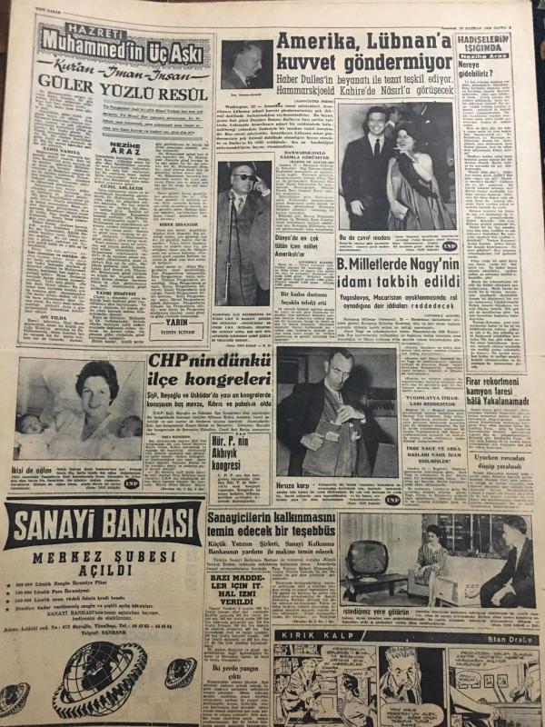 YENİ SABAH GAZETESİ 23 HAZİRAN 1958 YIL :21 SAYI :6934--Kıbrıs için dünkü mitingler ---İngiltere Amerika yı yokuşa sürdü ---CMP Kıbrıs ın tamamını istiyor---Türk görüşünü dikkate almayan İngiltere nin Bağdat Paktından ihraç edilmesi ihtimali belirdi ---Gökay ,dün gece İstanbul a geldi --Lüks bir tenezzüh motorü infilak etti ---Zam ve pahalılık sorusu ---İşsizlik sigortası :Siyavuşgil ---İstanbul Rehberi ---Amerika ,Lübnan a kuvvet göndermiyor --B.Milletlerde Nagy nin idamı takbih edildi --CHP nin dünkü ilçe kongreleri ---Sanayicilerin kalkınmasını temin edecek bir teşebbüs ---Dünya Kupası nda 2. olduk 38 puanla Rusya şampiyon ---Galatasaray ,Güneş i mağlup etti :2-1--Beşiktaş ,Beykoz u farklı yendi :4-1---Fenerbahçe rövanşta da Vefa ya yenildi :1-0--Makarios İngiltere ile ikili müzakere teklif ediyor ---Şehir hatlarının yeni fiyatları tespit edildi ---Bugünkü Meclis --Başvekil imar sahalarını gezdi --- adlı eser, Kitap > Süreli Yayınlar > Gazeteler > Türkiye > Genel > Günlük kategorisinde İkinci El olarak satıştadır.