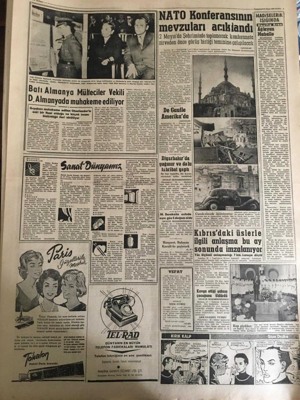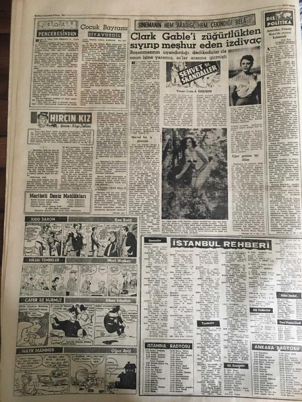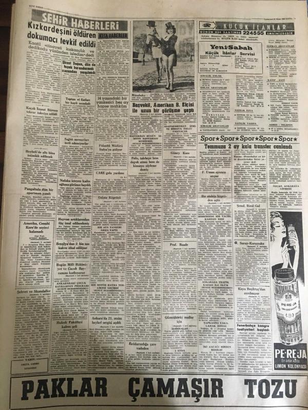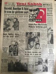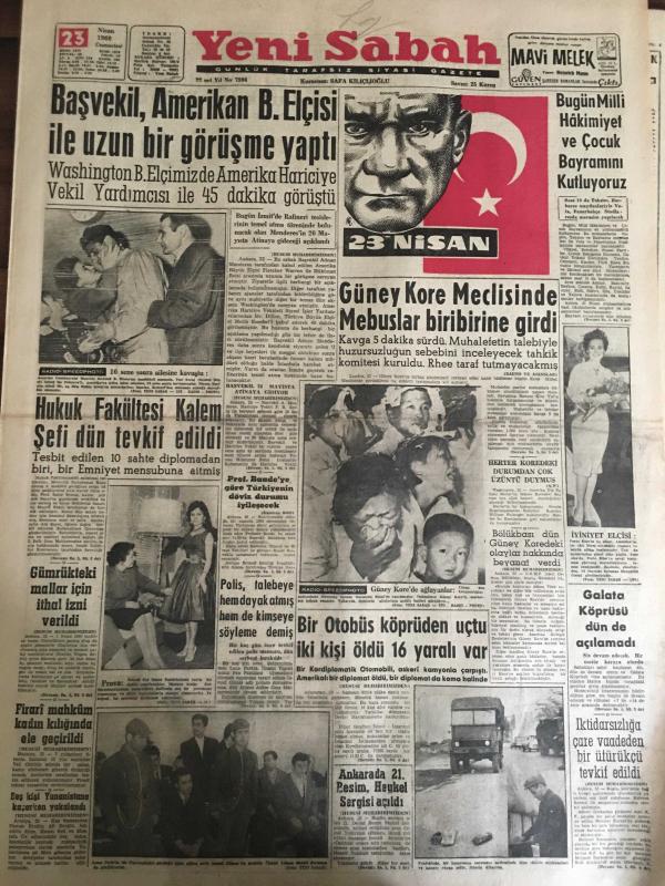 YENİ SABAH GAZETESİ 23 NİSAN 1960 YIL :22 SAYI :7594--Başvekil ,Amerikan B.Elçisi ile Uzun Bir Görüşme Yaptı --Hukuk Fakültesi Kalem Şefi Dün Tevkif Edildi ---Güney Kore Meclisinde Mebuslar Birbirine Girdi ---Bugün Milli Hakimiyet ve Çocuk Bayramını Kutluyoruz --Gümrükteki mallar için ithal izni verildi --Polis ,talebeye hem dayak atmış hem de kimseye söyleme demiş --Bir otobüs köprüden uçtu 2 kişi öldü 16 yaralı var --Ankara da 21.Resim Heykel Sergisi Açıldı---Çocuk Bayramı :Siyavuşgil ---Clark Gable i züğürtlükten sıyırıp meşhur eden izdivaç ---İstanbul Rehberi ---NATO Konferansının Mevzuları Açıklandı --Batı Almanya Mülteciler Vekili D.Almanya Muhakeme Ediliyor ---Kıbrıs da ki üslerle ilgili anlaşma bu ay sonunda imzalanıyor ---Sinema :Aşk Kurbanı --Kız kardeşini öldüren dokumacı tevkif edildi ---Galatasaray -K.Yaka ,Fenerbahçe -Ankaragücü --Temmuza 2 ay kala transfer canlandı --Amerikalı D.James 100 M.de 10.2 yaptı --Tenis de İstanbul Viyana bugün karşılaşıyor --- Yıpranma, sararmalar, kupon kesiği ve yırtılmalar zamana bağlı olarak görülebilir.
