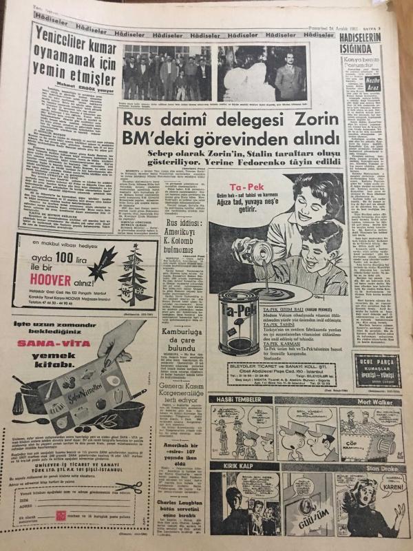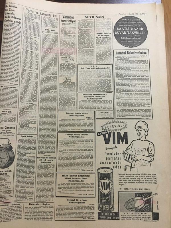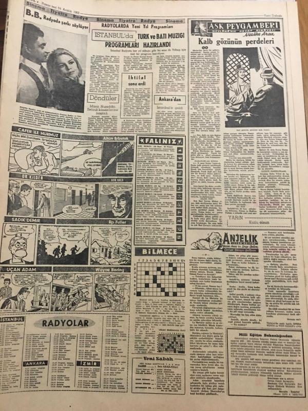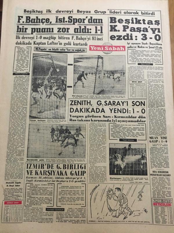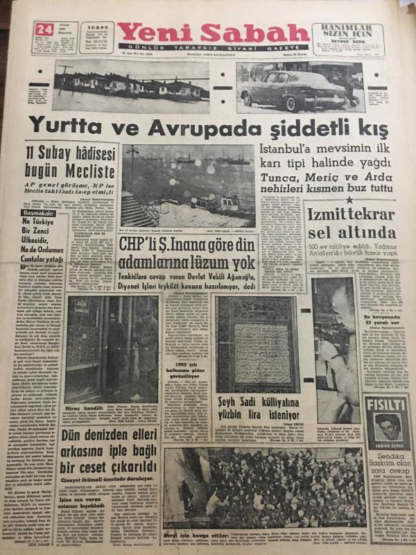 YENİ SABAH GAZETESİ 24 ARALIK 1962 YIL :25 SAYI :8544---Yurtta ve Avrupa da Şiddetli Kış --CHP 'li Ş.İnan 'a göre din adamlarına lüzum yok --İzmit tekrar sel bastı ---Dün denizden elleri arkasına iple bağlı bir ceset çıkarıldı --Şeyh Sadi Külliyatına Yüz Bin Lira İsteniyor ---Ferhan Onat Rumanya da :Siyavuşgil --Amerika'ya gitmek için kaçan 3 çocuk yakalandı ---Rus daimi delegesi Zorin BM de ki görevinden alındı --Fenerbahçe ,İst.Spor dan bir puanı zor aldı :1-1---Beşiktaş K.Paşa 'yı ezdi :3-0--ZENITH ,Galatasaray 'ı son dakika yendi :1-0---İzmir de G.Birliği ve Karşıyaka Galip ---Başmakale :Ne Türkiye Bir Zenci Ülkesidir ,Ne de Ordumuz Cuntalar Yatağı ---İstanbul a mevsimin ilk karı tipi halinde yağdı --- Yıpranma, sararmalar, kupon kesiği ve yırtılmalar zamana bağlı olarak görülebilir.