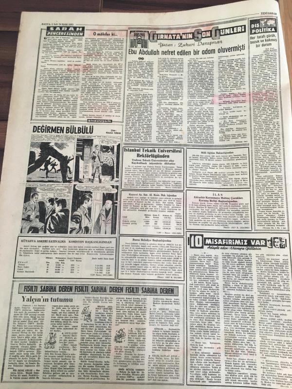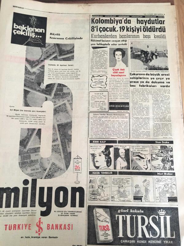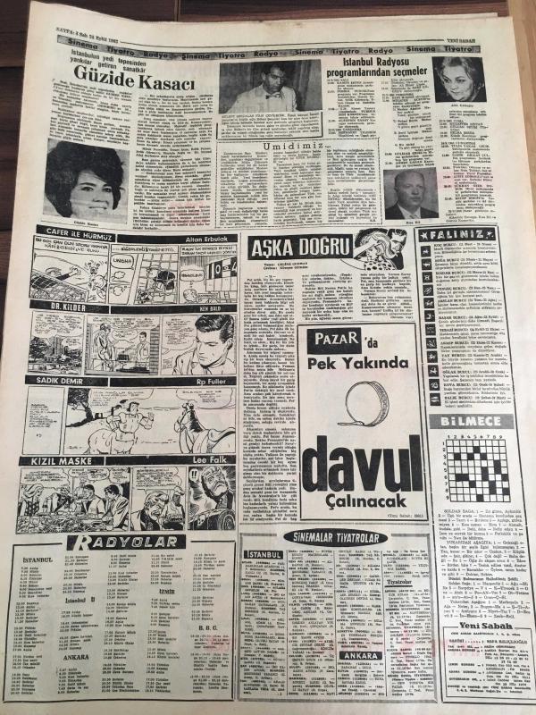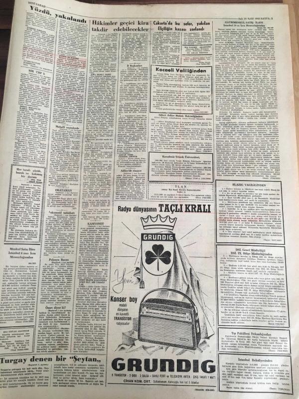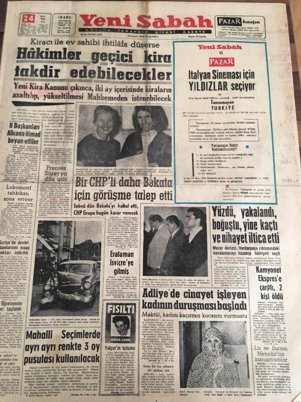YENİ SABAH GAZETESİ 24 EYLÜL 1963 YIL :26 SAYI :8811--Hakimler geçici kira takdir edebilecekler --Bir CHP ''li daha Bekata için görüşme talep etti --Erataman İsviçre ye gitmiş --Yüzdü yakalandı boğuştu yine kaçtı ve nihayet iltica etti --Adliye 'de cinayet işleyen kadının duruşması başladı --Mahalli seçimlerde ayrı ayrı renkte 3 oy pusulası kullanılacak --O Mahiler ki :Siyavuşgil --Kolombiya da haydutlar 8'i çocuk ,19 kişiyi öldürdü --İstanbul yedi tepesinden yankılar getiren sanatkar :Güzide Kasacı --İstanbul Radyosu Programlarından Seçmeler---Polonya Beraberliği Almanları Korkuttu --Türk Kalesinde Turgay denen bir şeytan vardı --Türkiye - İspanya Maçında Arbede --Kamyonet Ekspres'e çarptı 2 kişi öldü --Suriye devlet adamlarının maaş miktarı indirildi -- Yıpranma, sararmalar, kupon kesiği ve yırtılmalar zamana bağlı olarak görülebilir.