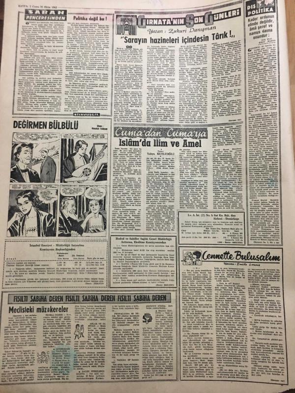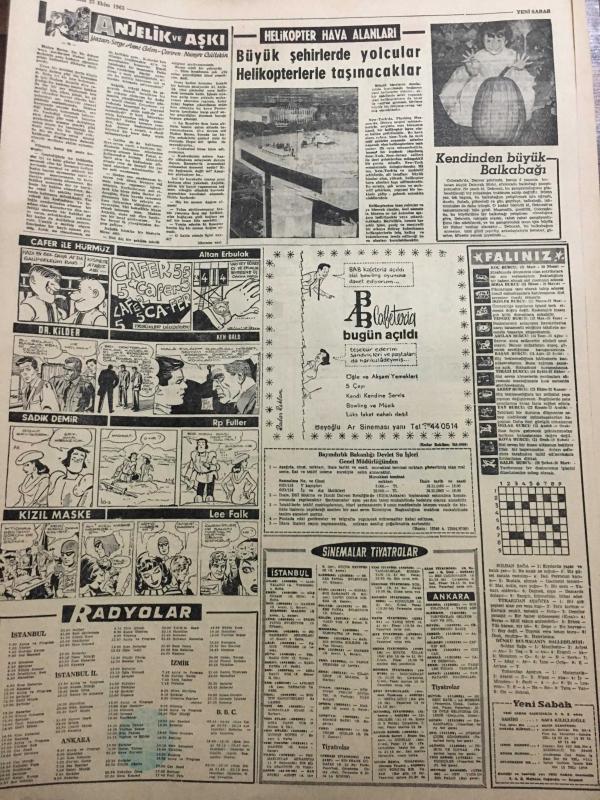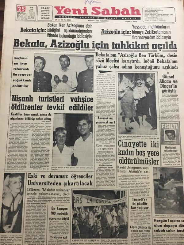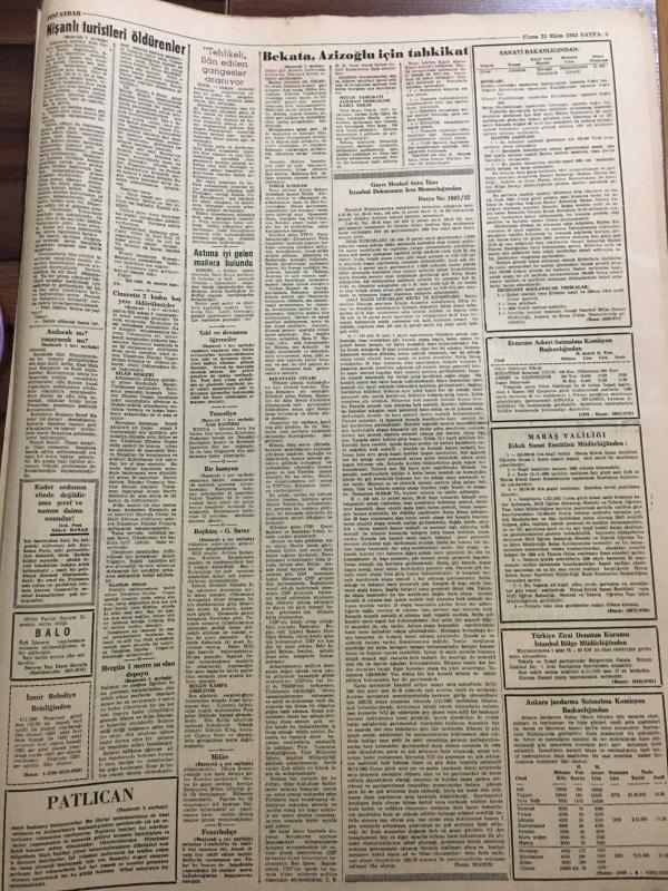 YENİ SABAH GAZETESİ 25 EKİM 1963 YIL :26 SAYI :8842---Bekata içi : Bakan iken Azizoğluna dair bildiğini açıklamadığından iftirada bulunduğu iddiasıyla ,Azizoğlu için :Yassıada mahkumlarını himaye ,Zeki Erataman firarına yardım iddiasıyla ---Nişanlı turistleri vahşice öldürenler tevkif edildiler ----Gürsel Alican ve Dinçer le Görüştü -----Cinayette iki kadın boş yere öldürülmüşler ---Eski ve devamsız öğrenciler Üniversiteden çıkartılacak ---Tunceli ye üç gündür kar yağıyor ---Politika değil bu :Siyavuşgil ---Karayolları için Amerika 18 milyon dolar kredi veriyor ---Françoise Arnoul uçakta intihara teşebbüs etmişti ---Beşiktaş ,Galatasaray için dün kampa girdi ---Fenerbahçe -Linfield maçının ilki 13 Kasım da ----2-1 lik galibiyetten sonra kaybolan prestij geri geldi ----Türkiye Kupası İkinci Kademe Maçları Programı Tesbit Edildi ---Olimpiyakos ve Dinamo ikinci tura atladılar ---- Yıpranma, sararmalar, kupon kesiği ve yırtılmalar zamana bağlı olarak görülebilir.