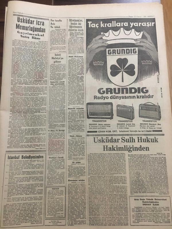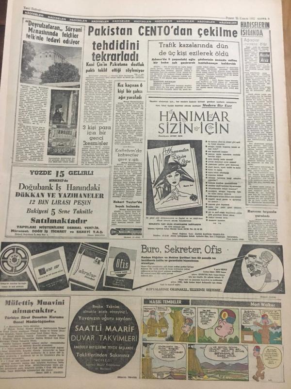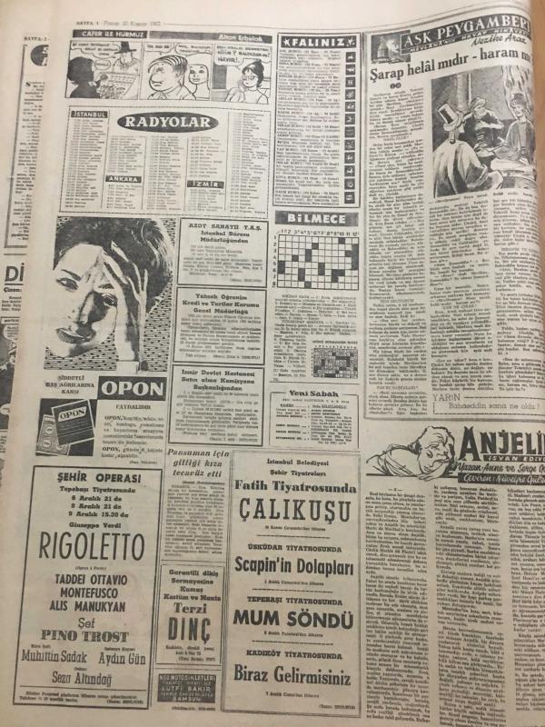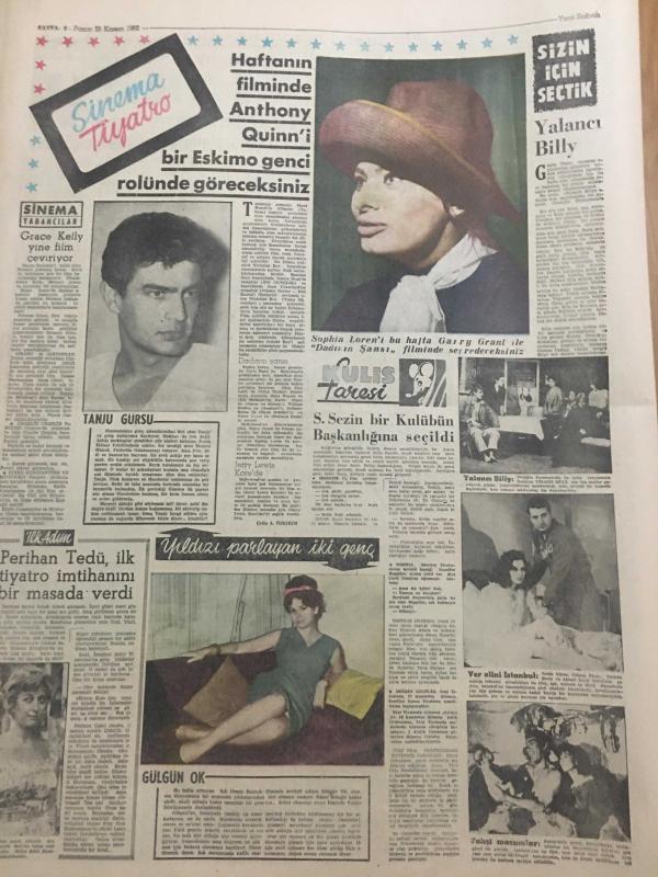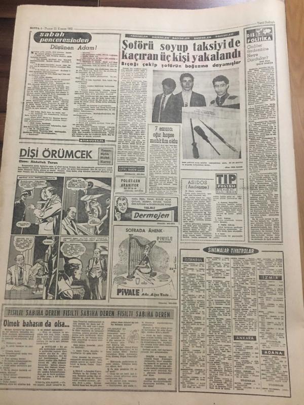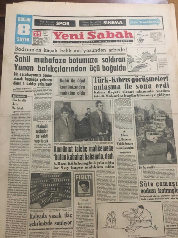 YENİ SABAH GAZETESİ 25 KASIM 1962 YIL :25 SAYI :8515---Sahil muhafaza botumuza saldıran Yunan balıkçılarından üçü boğuldu --Baba ile oğul komünizmden mahkum oldu --Türk -Kıbrıs Görüşmeleri anlaşma ile sona erdi --Komünist talebe mahkemede bütün kabahat babamda dedi ---İtalya da yasak ilaç şehrimizde satılıyor --Düşünen Adam :Siyavuşgil --Şoförü soyup taksiyi de kaçıran üç kişi yakalandı ---Pakistan CENTO dan çekilme tehdidini tekrarladı --Türkiye -İsrail --Beykoz dün de Demir spora karşı namağlup unvanını korudu :2-0---Haftanın filminde Anthony Quinn'i bir Eskimo genci rolünde göreceksiniz --Grace Kelly yine film çeviriyor --Tansu Gürsu --Perihan Tedü ,ilk tiyatro imtihanını bir masa da verdi --Gülgün Ok --Donanma Kamil 5-1 'lik Türkiye-İsrail Maçını Anlatıyor -- Yıpranma, sararmalar, kupon kesiği ve yırtılmalar zamana bağlı olarak görülebilir.