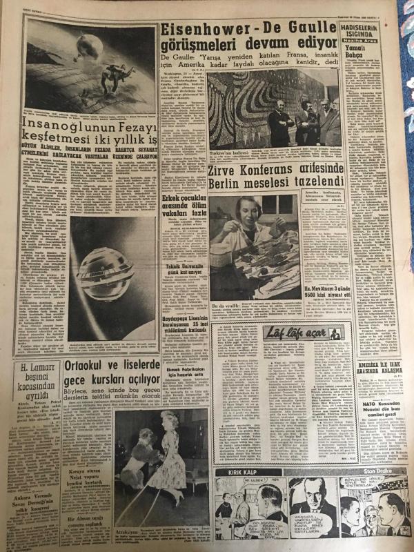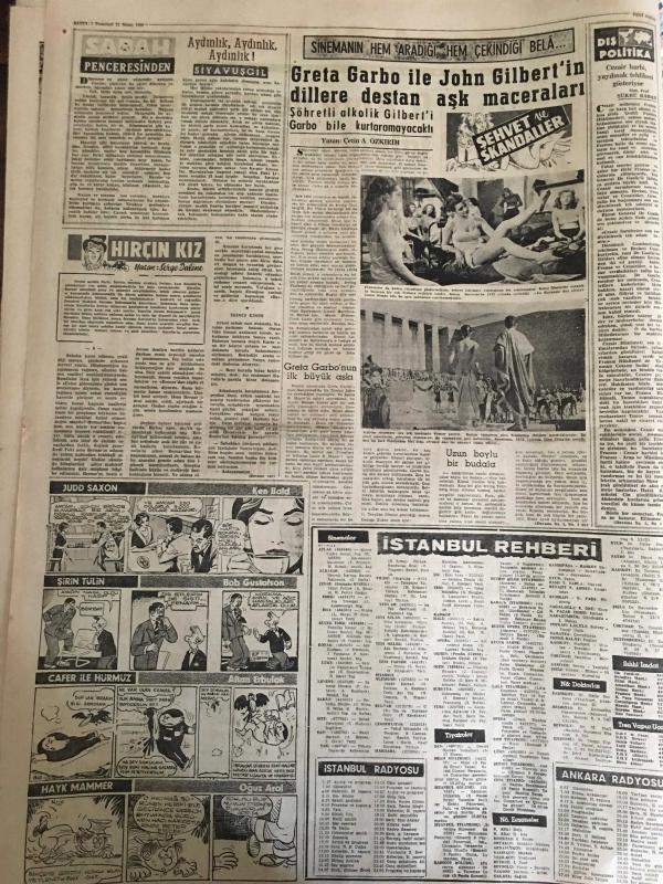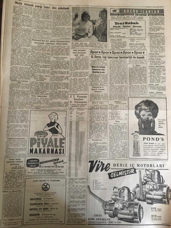 YENİ SABAH GAZETESİ 25 NİSAN 1960 YIL :22 SAYI :7596---G.Kore de muhalefetin talepleri kabul ediliyor --Moda cinayeti sanığı Sabri , dün yakalandı ---B.Amerika da Stevenson un başkan adayı olması muhtemel---Ankara da bir genç kavgacıları ayırmak isterken ,öldürüldü --İran da zelzele bir şehri harap etti ---Doğu illerindeki iskan durumuyla ilgili teklif --Aydınlık ,aydınlık ,aydınlık :Siyavuşgil --Greta Garbo ile John Gilbert in dillere destan aşk maceraları ---Radyo Programları ---Eisenhower -De Gaulle görüşmeleri devam ediyor --Zirve Konferans arifesinde Berlin meselesi tazelendi ---Fenerbahçe ,Ş.Hilali de kolay mağlup etti :3-1---Galatasaray Ligi İzmirspor beraberliği ile kapadı ---Karagümrük Karşıyaka da yenilmekten kurtulamadı:2-1 --Amerikalı R.Boston uzunda 7.80 atladı --Vefa ile Ankaragücü puanları paylaştı ---Kıskançlık yüzünden kardeşini attı ---İnsanlığa aykırı hareketler takbih edildi --
