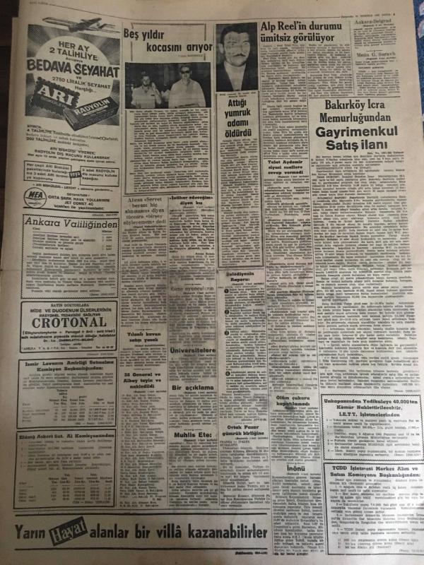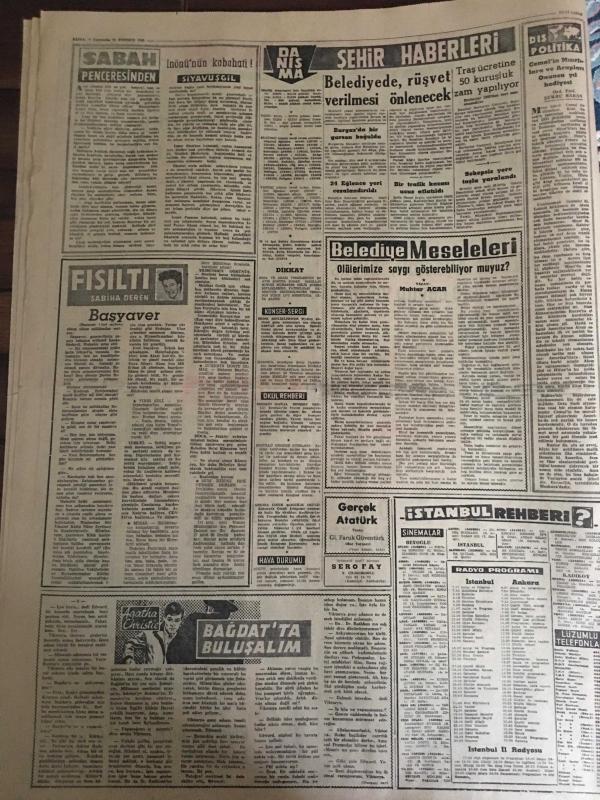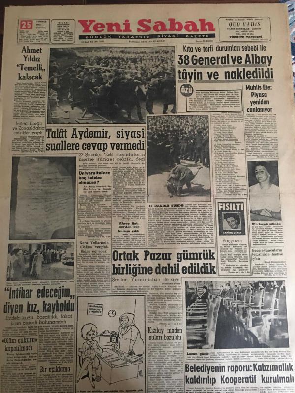 YENİ SABAH GAZETESİ 25 TEMMUZ 1962 YIL :25 SAYI :8392--Ahmet Yıldız Temelli Kalacak --Talat Aydemir ,siyasi suallerle cevap vermedi ---38 General ve Albay tayin ve nakledildi --Muhlis Ete: Piyasa yeniden canlanıyor --Ortak Pazar Gümrük Birliğine Dahil Edildik --İntihar edeceğim diyen kız kayboldu --Belediyenin raporu :Kabzımallık kaldırıp kooperatif kurulmalı --Kızılay maden suları bozuldu ---İnönü nün kabahati : Siyavuşgil --Belediye de rüşvet verilmesini önlenecek --Dış Olaylar : Sovyetler Büyük Askeri Manevralara Hazırlanıyor --Kızıl Çin Rusya ile olan anlaşmazlığını teyid etti --Attığı yumruk adamı öldürdü --Alp Reel durumu ümitsiz görülüyor --Beş yıldır kocasını arıyor ---Metin ,bugün tekrar Galatasaraylı oluyor --Beşiktaş Şampiyonluk Ümidiyle Dün Sezona Girdi --Ankara -Belgrad ,İstanbul - Telavıv --Milli Takıma yerli bir antrenör aranıyor --Can Bartu bugün gidiyor -- Yıpranma, sararmalar, kupon kesiği ve yırtılmalar zamana bağlı olarak görülebilir.