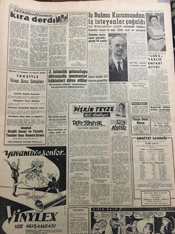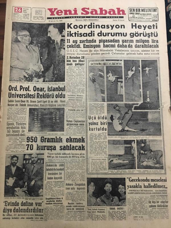 YENİ SABAH GAZETESİ 26 HAZİRAN 1959 YIL :22 SAYI :7294--Koordinasyon Heyeti iktisadi durumu görüştü --Ord.Prof.Onar ,İstanbul Üniversitesi Rektörü oldu ---950 Gramlık ekmek 70 kuruşa satılacak ---Üçü öldü yalnız biri kurtuldu --Evinde define var diye dolandırıldılar --Gecekondu meselesi yasakla halledilmez ---Rhein nehrinde :Siyavuşgil --Esrar satan bir aile birlikte mahkum oldu ---İstanbul Rehberi ---İş bulma kurumundan iş isteyenler çoğaldı --3. İstimlak yolsuzluğa davasında maznunlar hakimler dava ettiler ---Münir Beşiktaş la üç yıllık mukavele yaptı --Molnar ,Reise ve Fenerbahçe ye hakaret etmiş değilim diyor ---Turgay için dün de bir karar verilemedi --İzmir Kulüpleri İstanbulluları protesto ediyor ---Fenerbahçe Atletizm Bayramına Yedi Bulgar Atleti Katılıyor ---Spaak ,Türkiye seyahatim tam bir başarı ile neticelendi --2. Kota da 28 bin ton ithal malı geliyor ---Üç bir olup da bir çobanı öldürdüler -- Yıpranma, sararmalar, kupon kesiği ve yırtılmalar zamana bağlı olarak görülebilir.