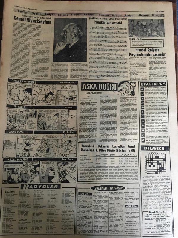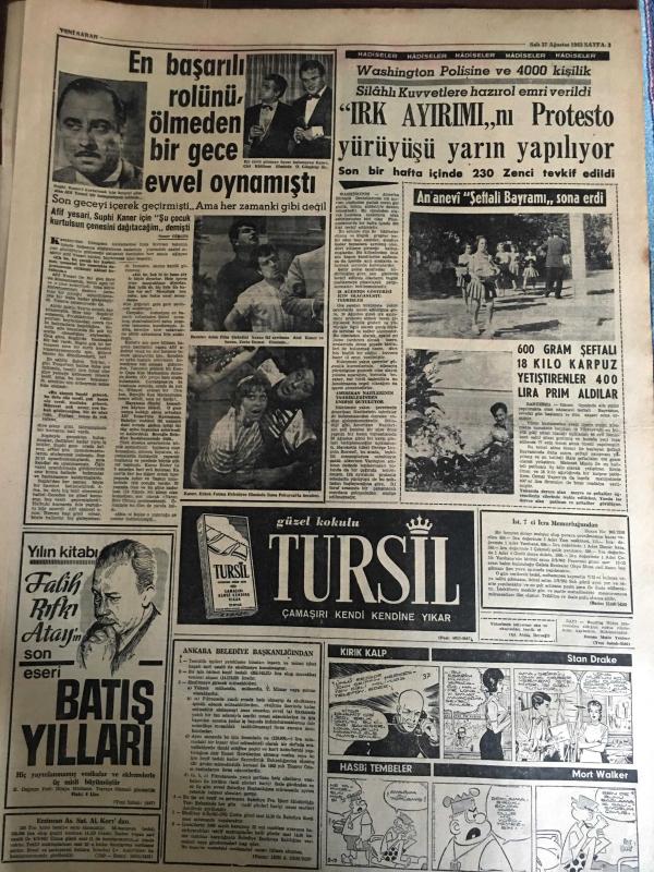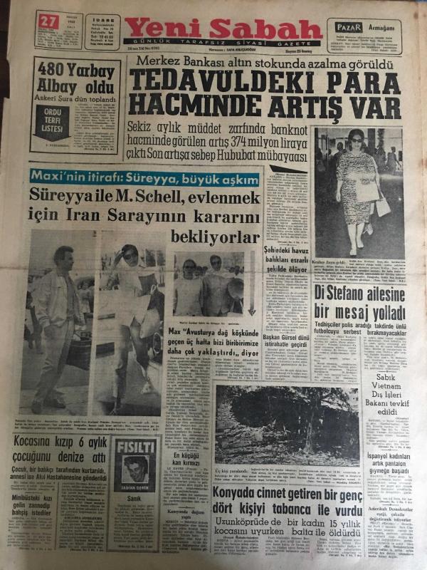 YENİ SABAH GAZETESİ 27 AĞUSTOS 1963 YIL :26 SAYI :8783---480 Yarbay Albay Oldu --Tedavüldeki Para Hacminde Artış Var --Süreyya ile M. Schell evlenmek için İran Sarayının kararını bekliyorlar ---Şehirde havuz balıkları esrarlı şekilde ölüyor---Di Stefano ailesine bir mesaj yolladı --Kocasına kızıp 6 aylık çocuğunu denize ---Konya da cinnet getiren bir genç dört kişiyi tabanca ile vurdu --Şikayetler azalmış mı ?: Siyavuşgil---Irk ayrımı protesto yürüyüşü yarın yapılıyor ---Kemençe yi en iyi çalan üsrad :Kemal Niyazi Seyhun --Yunanistan nın menfi turizm propagandası millet meclisine aksettirildi --Sovyet Elçisi Kanada yı tehdit etti --1965 Junior Şampiyonası Türkiye de Yapılacak ---Tusder : Beşiktaş ı geçen seneden iyi gördüm dedi --Fenerbahçe yarın gece Beykoz la oynayacak ---İş Bankası Yelken Yarışları ---Minibüste ki kızı gelin zannedip bahşiş istediler --Sabık Vietnam Dış İşleri Bakanı Tevkif Edildi--İspanyol kadınları artık pantolon giymeye başladı Yıpranma, sararmalar, kupon kesiği ve yırtılmalar zamana bağlı olarak görülebilir.