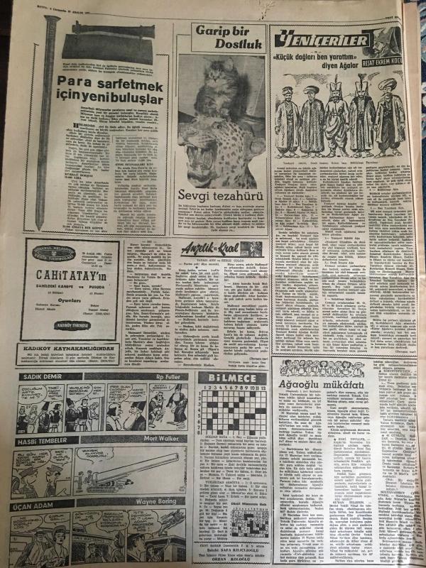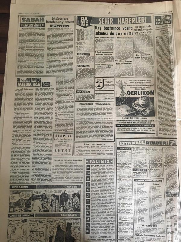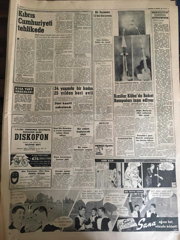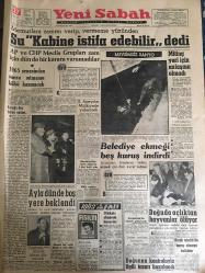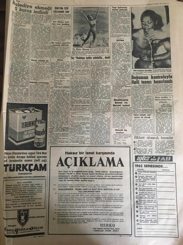YENİ SABAH GAZETESİ 27 ARALIK 1961 YIL :24 SAYI :8187---Su kabine istifa edebilir dedi --1965 senesinden sonra sıtmanın kökü kazınacak --Belediye ekmeği beş kuruş indirdi --Ayla dünde boş yere beklendi --Doğuda açlıktan hayvanlar ölüyor --Miting yeri için anlaşma olmadı ---B.Apaydın Mülkiyede yuhalandı --Mebuslara benden söylenmesi :Siyavuşgil --Radyo Programları ---Bir veznedar 12 bin lira yemiş ---34 yaşında bir kadın 25 yıldan beri evli --Kızıllar Küba da Roket Rampaları İnşa Ediyor ---Doğumun kontroluyla ilgili tasarı hazırlandı --Güreşçiler bugün Tahran a gidiyor --Dün Fenerbahçe çamurda Galatasaray salonda çalıştı --Türkiye hala 1940 futbolu oynuyor --İzmirlilere ihtar edildi --Junior lar şampiyonasına Rusya ilk defa katılıyor --Bıçak tehdidiyle haraç almaya kalktılar --Hususi bir uçak düştü 4 kişi öldü --Kulağa hoş gelen sesler --AP ve CHP Meclis Grupları zam için dün de bir karara varamadılar --CHP Meclisi Tebliğ Neşretti--- Yıpranma, sararmalar, kupon kesiği ve yırtılmalar zamana bağlı olarak görülebilir.