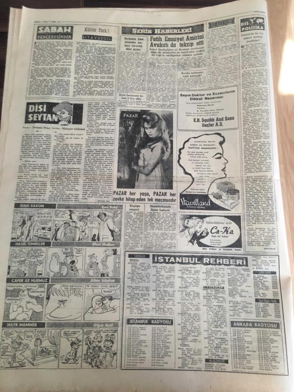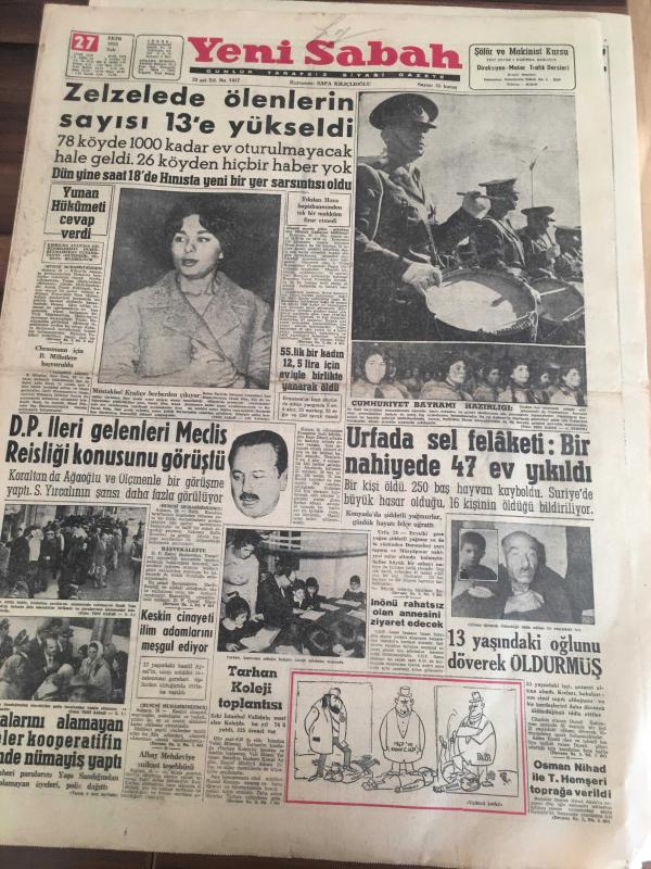 YENİ SABAH GAZETESİ 27 EKİM 1959 YIL :22 SAYI :7417---Zelzele de ölenlerin sayısı 13 'e yükseldi --DP İleri Gelenleri Meclis Reisliği Konusunu Görüştü --Urfa da sel felaketi :Bir nahiye 47 ev yıkıldı --Paralarını alamayan üyeler kooperatifin önünde nümayiş yaptı --Fatih Emniyet Amirini Avukatı da Tekzip Etti --Vitrin camını keserek bir mağazayı soydular --İran 'ın müstakbel Kraliçesi Şah 'ı mesut edebilecek mi ?--Bahsi müşterek aralık ta başlıyor --Galatasaray ve Beşiktaş Bugün Ankara 'ya Gidiyor --Vefa -Beykoz ,Fenerbahçe Adalet Yarın Oynuyor --Göztepeli idareciler Futbol federasyonu itham ediyor -- Yıpranma, sararmalar, kupon kesiği ve yırtılmalar zamana bağlı olarak görülebilir.