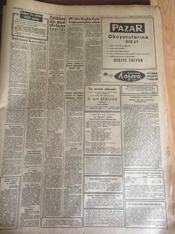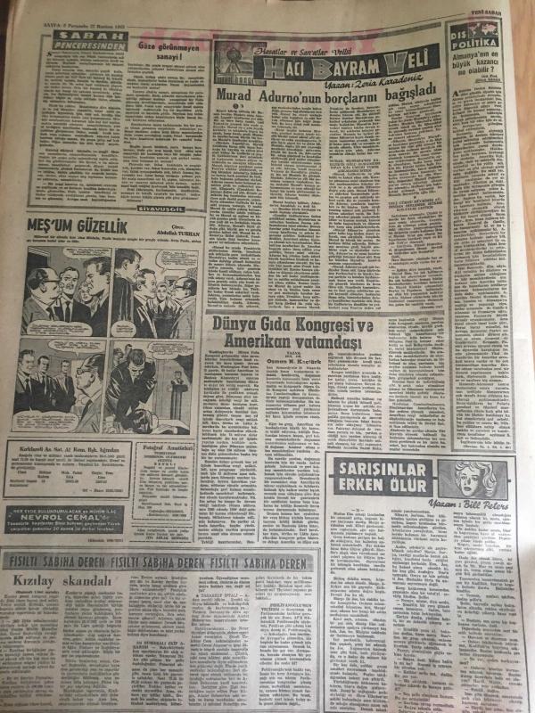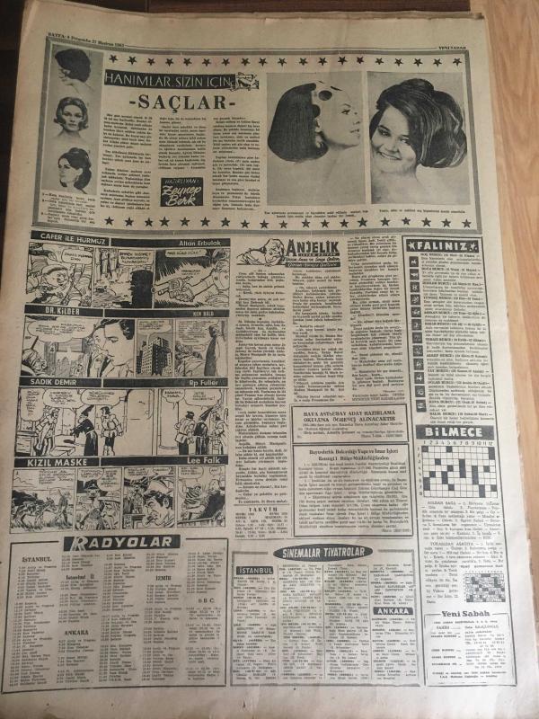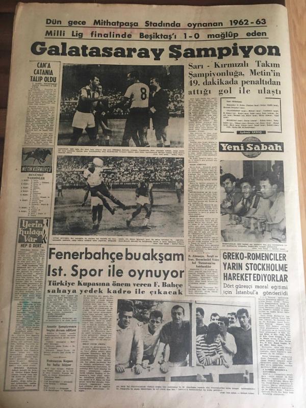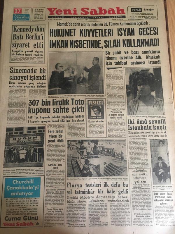 YENİ SABAH GAZETESİ 27 HAZİRAN 1963 YIL :26 SAYI :8723---Kennedy dün Batı Berlin 'i ziyaret etti ---Hükümet Kuvvetleri İsyan Gecesi İmkan Nisbetinde ,Silah Kullanmadı --Sinema da bir cinayet işlendi --307 bin liralık Toto kuponu sahte çıktı --Fare zehri yiyen bir çocuk öldü --İki ama sevgili İstanbul 'a kaçtı --Florya tesisleri ilk defa bu yıl tatminkar bir hale geldi --Göze Görünmeyen Sanayi :Siyavuşgil --30 Yıl Bir Adaya Hapsedilen Kadın Kurtarılınca Polislere Hücum Etti --1955 de Ramandan elde edilen 178 bin ton petrol 1962 de 595 bine çıktı ---Çelikbaş İçin Genel Görüşme Yapıldı --Dün Gece Mithatpaşa Stadında Oynann 1962-1963 Milli Lig Finalinde Beşiktaş 'ı 1-0 Mağlup Eden :Galatasaray Şampiyon --Fenerbahçe bu akşam Ist.Spor ile oynuyor --Greko --Romenciler Yarın Stockholme Hareket Ediyorlar --- Yıpranma, sararmalar, kupon kesiği ve yırtılmalar zamana bağlı olarak görülebilir.