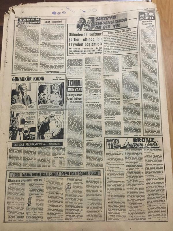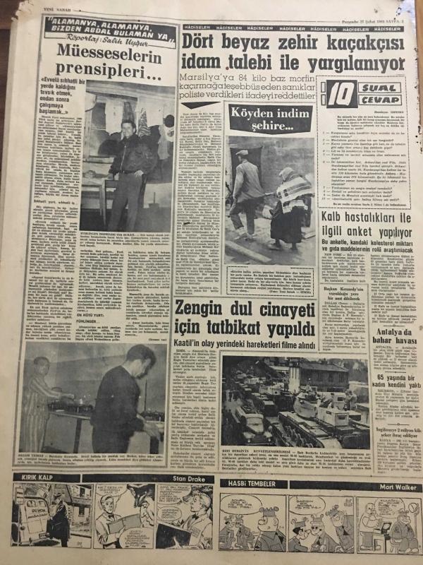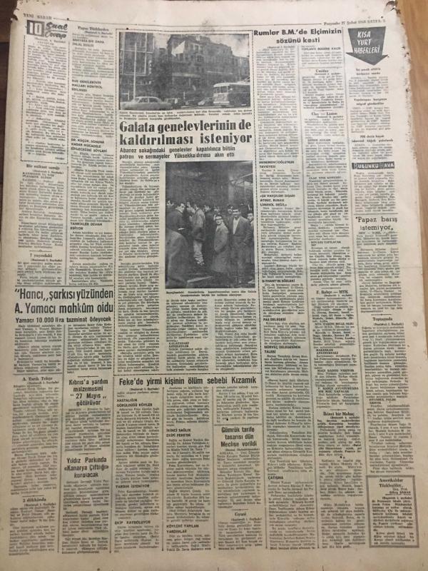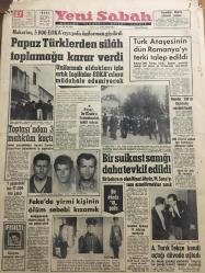 YENİ SABAH GAZETESİ 27 ŞUBAT 1964 YIL :26 SAYI :8965---Papaz Türklerden Silah Toplamaya Karar Verdi ---Türk Ataşesinin Dün Romanya yı Terki Talep Edildi ---Toptaş 'ndan 3 mahkum kaçtı ---Bir suikast sanığı daha tevkif edildi ---Feke yirmi kişinin sebebi kızamık --Rumlar BM de Elimizin sözünü kesti --A.Tarık Tekçe kendi açtığı dava da ağladı ---Ucuz İthamlar :Siyavuşgil --Dört beyaz zehir kaçakçısı idam talebi ile yargılanıyor --Zengin dul cinayeti için tatbikat yapıldı ---Galata Genel Evlerinde Kaldırılması İsteniyor ---Fenerbahçe -MTK --Clay ,Liston 'u Teknik Nakavtla Mağlup Etti ---Beşiktaş ve Feriköy İddialı Hazırlanıyor ---Ümit İdman Maçında Amatörlere Galip :3-2---- Yıpranma, sararmalar, kupon kesiği ve yırtılmalar zamana bağlı olarak görülebilir.
