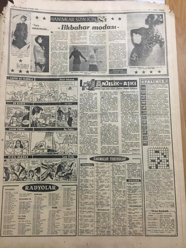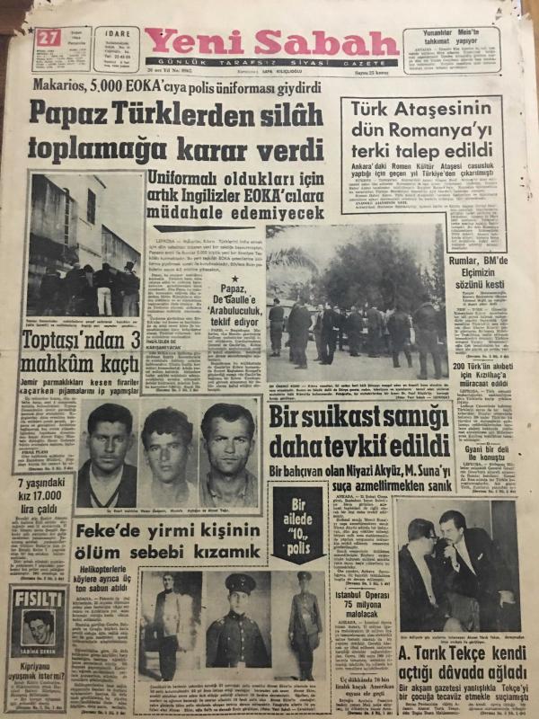 YENİ SABAH GAZETESİ 27 ŞUBAT 1964 YIL :26 SAYI :8965---Papaz Türklerden Silah Toplamaya Karar Verdi ---Türk Ataşesinin Dün Romanya yı Terki Talep Edildi ---Toptaş 'ndan 3 mahkum kaçtı ---Bir suikast sanığı daha tevkif edildi ---Feke yirmi kişinin sebebi kızamık --Rumlar BM de Elimizin sözünü kesti --A.Tarık Tekçe kendi açtığı dava da ağladı ---Ucuz İthamlar :Siyavuşgil --Dört beyaz zehir kaçakçısı idam talebi ile yargılanıyor --Zengin dul cinayeti için tatbikat yapıldı ---Galata Genel Evlerinde Kaldırılması İsteniyor ---Fenerbahçe -MTK --Clay ,Liston 'u Teknik Nakavtla Mağlup Etti ---Beşiktaş ve Feriköy İddialı Hazırlanıyor ---Ümit İdman Maçında Amatörlere Galip :3-2----, SAFA KILIÇLIOĞLU tarafından kaleme alınmıştır. Kitap 1964 yılında [YENİ SABAH MATBAA] o ISBN kodu ile yayınlanmıştır. 6 sayfadır. YENİ SABAH GAZETESİ 27 ŞUBAT 1964 YIL :26 SAYI :8965---Papaz Türklerden Silah Toplamaya Karar Verdi ---Türk Ataşesinin Dün Romanya yı Terki Talep Edildi ---Toptaş 'ndan 3 mahkum kaçtı ---Bir suikast sanığı daha tevkif edildi ---Feke yirmi kişinin sebebi kızamık --Rumlar BM de Elimizin sözünü kesti --A.Tarık Tekçe kendi açtığı dava da ağladı ---Ucuz İthamlar :Siyavuşgil --Dört beyaz zehir kaçakçısı idam talebi ile yargılanıyor --Zengin dul cinayeti için tatbikat yapıldı ---Galata Genel Evlerinde Kaldırılması İsteniyor ---Fenerbahçe -MTK --Clay ,Liston 'u Teknik Nakavtla Mağlup Etti ---Beşiktaş ve Feriköy İddialı Hazırlanıyor ---Ümit İdman Maçında Amatörlere Galip :3-2---- adlı eser Türkçe dilindedir.