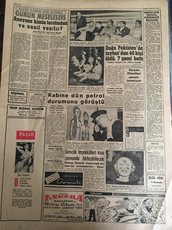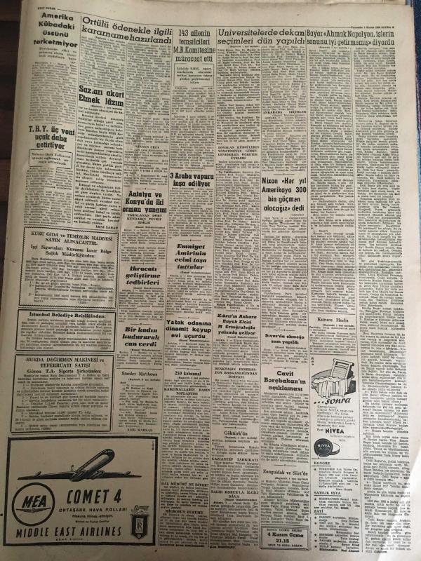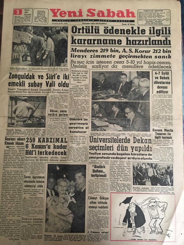 YENİ SABAH GAZETESİ 3 KASIM 1960 YIL :23 SAYI :7779---Örtülü ödenekle ilgili kararname hazırlandı --Zonguldak ve Siirt e iki emekli subay vali oldu --259 Kabzımal 6 Kasım a kadar Hal i terk edecek --Üniversiteler de Dekan Seçimleri Dün Yapıldı ---6-7 Eylül ve bebek davalarına devam ediliyor --Atatürk Haftası Tertiplendi --Cüneyt Özdemir aftan istifade etmeyi reddetti --Sivas Öğretmen Okulunda Talebe Nümayişi Oldu --Aşığıyla beraber kocasını öldürdü ---Ferit Yok ,Millet Var !:Siyavuşgil --Bayar Ahmak Napolyon ,İşlerin Sonunu İyi Getirmemiş Diyordu --İstanbul Rehberi ---Doğu Pakistan da tayfundan 40 kişi öldü ,7 gemi battı --Kabine dün petrol durumunu görüştü ---Gençlik teşekkülleri kısa zamanda birleştirilecek ---B.Takımına Birol ,Şenol Candemir ,Zekai alındı ---Bulgaristan a üç müşahit gidecek --Atletizm federasyonu dün ana meselelerini açıkladı --Galatasaray kampa giriyor --D.Sporlu futbolcular serbest bırakıldılar --Mathews 46 yaşında hala futbol oynuyor --- Yıpranma, sararmalar, kupon kesiği ve yırtılmalar zamana bağlı olarak görülebilir.