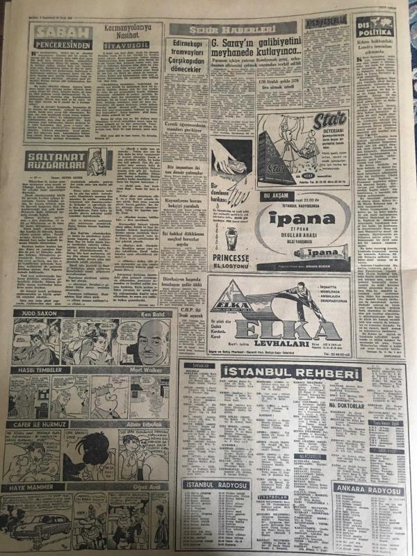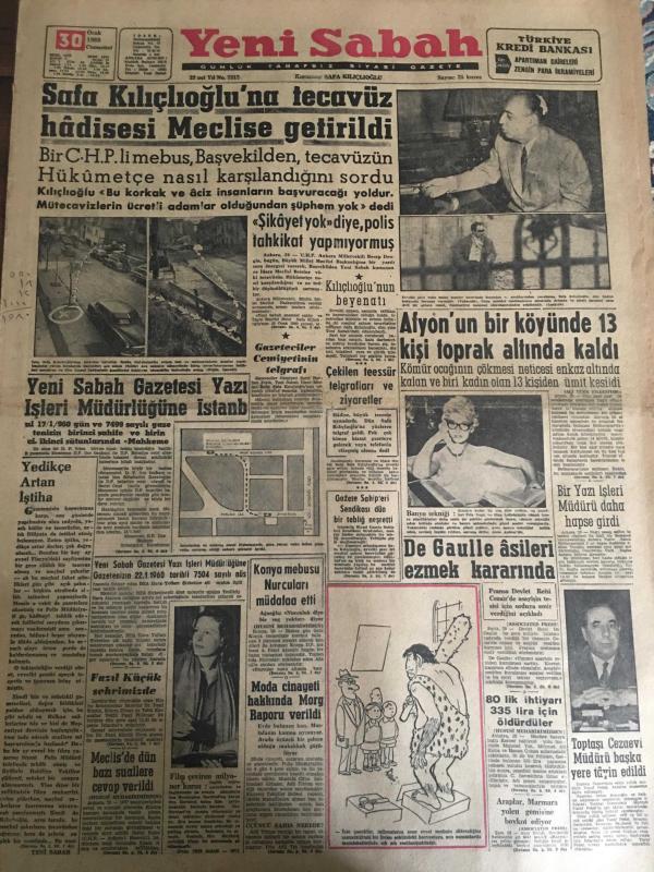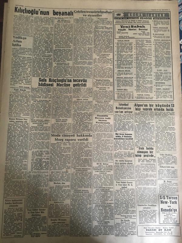 YENİ SABAH GAZETESİ 30 OCAK 1960 YIL :22 SAYI :7512---Safa Kılıçlıoğlu na tecavüz hadiseleri meclise getirildi --Yeni Sabah Gazetesi Yazı İşleri Müdürlüğüne ---Afyon un bir köyünde 13 kişi toprak altında kaldı ---Çekilen teessür telgrafları ve ziyaretler--De Gaulle asilleri ezmek kararında --Konya mebusu Nurcuları müdafaa etti ---Moda cinayeti hakkında morg raporu verildi ---80 lik ihtiyarı 335 lira için öldürdüler --Fazıl Küçük şehrimizde --Karmanyolacıya Nasihat :Siyavuşgil --İstanbul Rehberi ---Gelibolu Muhribi bir motoru batırdı --Bir Rus gemisi ağları parçalandı --1959 türün ikramiyesi tespit ve ilan olundu --İzmir dün 8 saat elektriksiz kaldı ---Sinema :Hayat Cilveleri ,Ateşten Damla ,Casino de Paris --Lider Beşiktaş bugün Vefa ile karşılaşıyor --Fenerbahçeli Muhalifeler iki grupa ayrıldılar --Fenerbahçe -Akademik --Türkiye -Fransa Voleybol maçı bugün --M.Sezer Adaletten 18.000 lira istiyor --F.Uman istafa etti---Antrenörler ne diyor ?--Meclis de dün bazı suallere cevap verildi, SAFA KILIÇLIOĞLU tarafından kaleme alınmıştır. Kitap 1960 yılında [YENİ SABAH MATBAA] o ISBN kodu ile yayınlanmıştır. 6 sayfadır. YENİ SABAH GAZETESİ 30 OCAK 1960 YIL :22 SAYI :7512---Safa Kılıçlıoğlu na tecavüz hadiseleri meclise getirildi --Yeni Sabah Gazetesi Yazı İşleri Müdürlüğüne ---Afyon un bir köyünde 13 kişi toprak altında kaldı ---Çekilen teessür telgrafları ve ziyaretler--De Gaulle asilleri ezmek kararında --Konya mebusu Nurcuları müdafaa etti ---Moda cinayeti hakkında morg raporu verildi ---80 lik ihtiyarı 335 lira için öldürdüler --Fazıl Küçük şehrimizde --Karmanyolacıya Nasihat :Siyavuşgil --İstanbul Rehberi ---Gelibolu Muhribi bir motoru batırdı --Bir Rus gemisi ağları parçalandı --1959 türün ikramiyesi tespit ve ilan olundu --İzmir dün 8 saat elektriksiz kaldı ---Sinema :Hayat Cilveleri ,Ateşten Damla ,Casino de Paris --Lider Beşiktaş bugün Vefa ile karşılaşıyor --Fenerbahçeli Muhalifeler iki grupa ayrıldılar --Fenerbahçe -Akademik --Türkiye -Fransa Voleybol maçı bugün --M.Sezer Adaletten 18.000 lira istiyor --F.Uman istafa etti---Antrenörler ne diyor ?--Meclis de dün bazı suallere cevap verildi adlı eser Türkçe dilindedir.