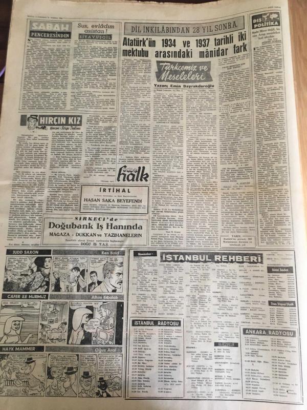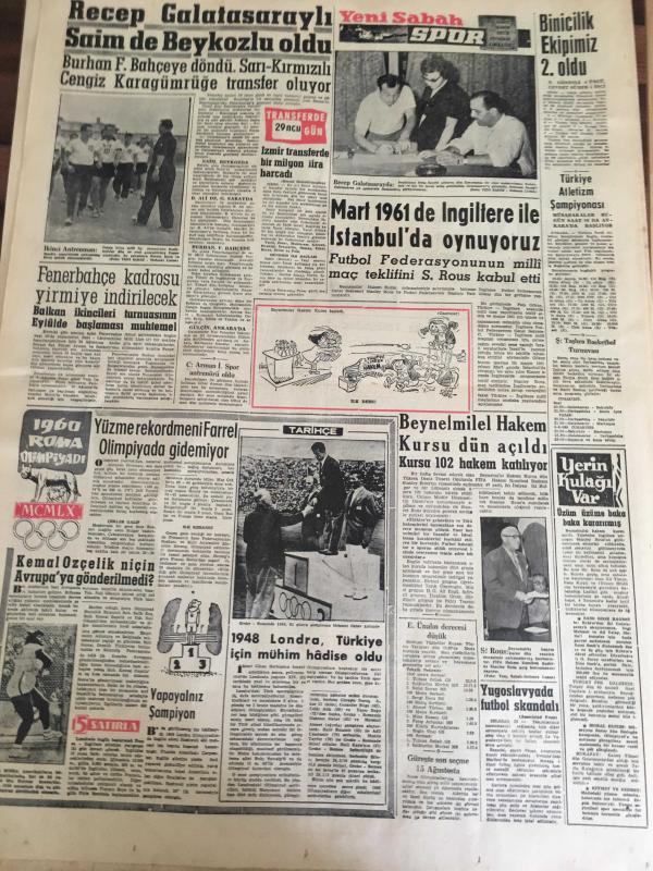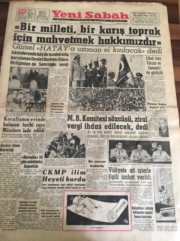 YENİ SABAH GAZETESİ 30 Temmuz 1960 YIL :23 SAYI :7680---Bir milleti ,bir karış toprak için mahvetmek hakkımızdır : Gürsel Hatay 'a uzanan el kırılacak dedi --Cihat iren Tüccar ve Sanayici ile Görüştü ----Refik Koraltan 'ın evinde bulunan tarihi eşya müzelere iade edildi ---M.B Komitesi sözcüsü zirai vergi ihdas edilecek dedi ---CMKP İlim Heyeti Kurdu --Vilayete ağır işlerle ilgili izahat verildi --Dil inkılabından 28 yıl sonra :Atatürk 'ün 1934 ve 1937 tarihli iki mektubu arasındaki manidar fark --Kızılay Meydanın adı Hürriyet Meydanı Oldu --Adalet Bakanlığında Yeni Nakil ve Tayinler --Amerikalıların bikinisi Fransızları bile şaşırttı --Recep Galatasaraylı Saim de Beykozlu Oldu --Mart 1961 de İngiltere ile İstanbul da oynuyoruz --Beynelmilel Hakem Kursu Dün Açıldı --Kemal Özçelik niçin Amerika 'ya gönderilemedi --1948 Londra Türkiye için Mühim Hadise Oldu ---, SAFA KILIÇLIOĞLU tarafından kaleme alınmıştır. Kitap 1960 yılında [YENİ SABAH MATBAA] o ISBN kodu ile yayınlanmıştır. 6 sayfadır. YENİ SABAH GAZETESİ 30 Temmuz 1960 YIL :23 SAYI :7680---Bir milleti ,bir karış toprak için mahvetmek hakkımızdır : Gürsel Hatay 'a uzanan el kırılacak dedi --Cihat iren Tüccar ve Sanayici ile Görüştü ----Refik Koraltan 'ın evinde bulunan tarihi eşya müzelere iade edildi ---M.B Komitesi sözcüsü zirai vergi ihdas edilecek dedi ---CMKP İlim Heyeti Kurdu --Vilayete ağır işlerle ilgili izahat verildi --Dil inkılabından 28 yıl sonra :Atatürk 'ün 1934 ve 1937 tarihli iki mektubu arasındaki manidar fark --Kızılay Meydanın adı Hürriyet Meydanı Oldu --Adalet Bakanlığında Yeni Nakil ve Tayinler --Amerikalıların bikinisi Fransızları bile şaşırttı --Recep Galatasaraylı Saim de Beykozlu Oldu --Mart 1961 de İngiltere ile İstanbul da oynuyoruz --Beynelmilel Hakem Kursu Dün Açıldı --Kemal Özçelik niçin Amerika 'ya gönderilemedi --1948 Londra Türkiye için Mühim Hadise Oldu --- adlı eser Türkçe dilindedir.