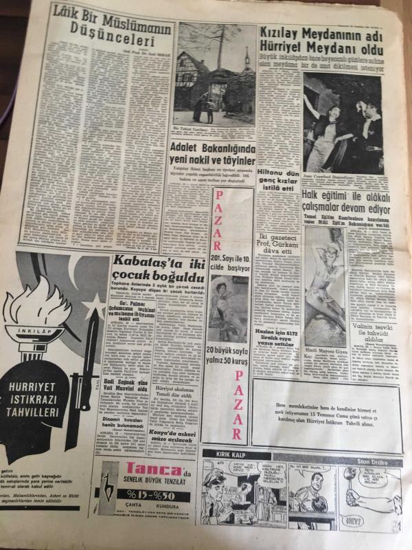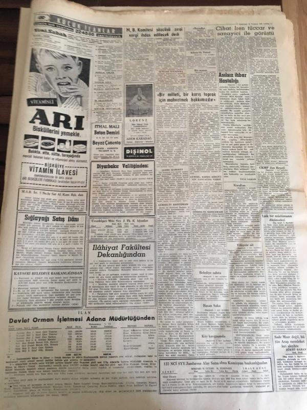 YENİ SABAH GAZETESİ 30 Temmuz 1960 YIL :23 SAYI :7680---Bir milleti ,bir karış toprak için mahvetmek hakkımızdır : Gürsel Hatay 'a uzanan el kırılacak dedi --Cihat iren Tüccar ve Sanayici ile Görüştü ----Refik Koraltan 'ın evinde bulunan tarihi eşya müzelere iade edildi ---M.B Komitesi sözcüsü zirai vergi ihdas edilecek dedi ---CMKP İlim Heyeti Kurdu --Vilayete ağır işlerle ilgili izahat verildi --Dil inkılabından 28 yıl sonra :Atatürk 'ün 1934 ve 1937 tarihli iki mektubu arasındaki manidar fark --Kızılay Meydanın adı Hürriyet Meydanı Oldu --Adalet Bakanlığında Yeni Nakil ve Tayinler --Amerikalıların bikinisi Fransızları bile şaşırttı --Recep Galatasaraylı Saim de Beykozlu Oldu --Mart 1961 de İngiltere ile İstanbul da oynuyoruz --Beynelmilel Hakem Kursu Dün Açıldı --Kemal Özçelik niçin Amerika 'ya gönderilemedi --1948 Londra Türkiye için Mühim Hadise Oldu --- Yıpranma, sararmalar, kupon kesiği ve yırtılmalar zamana bağlı olarak görülebilir.