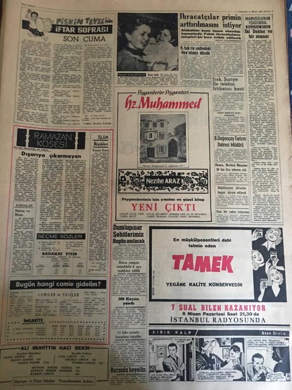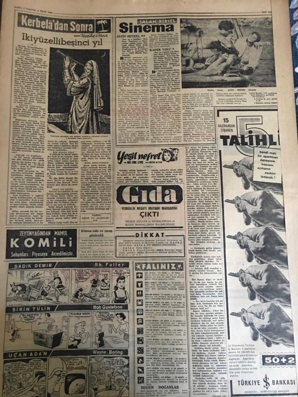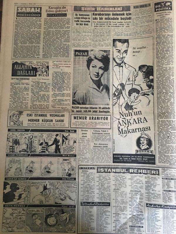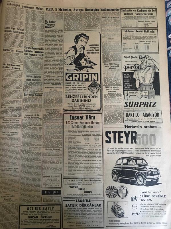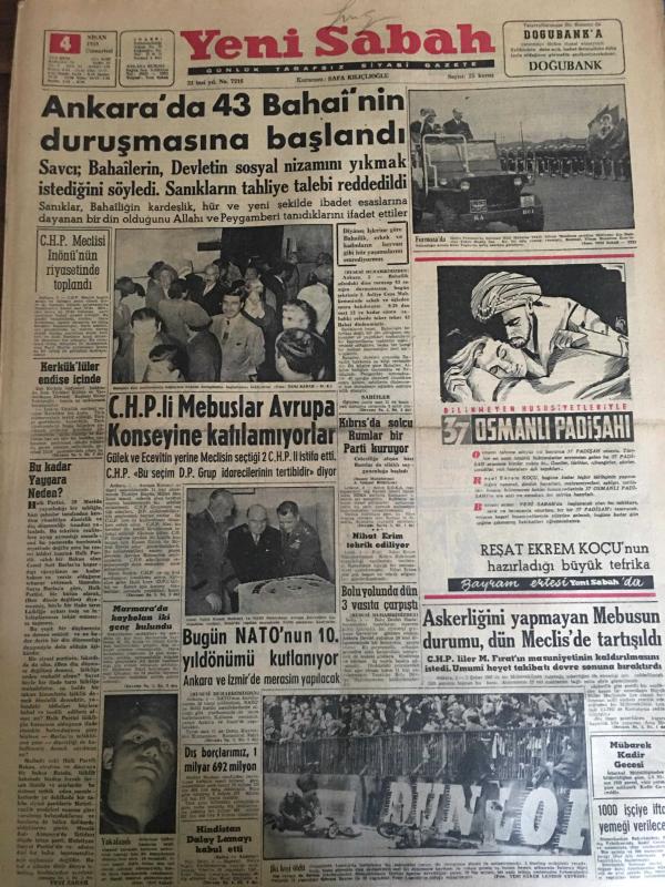 YENİ SABAH GAZETESİ 4 NİSAN 1959 YIL :21 SAYI :7216--Ankara sa 43 Bahai nin duruşmasına başlandı --CHP li Mebuslar Avrupa Konseyine Katılamıyorlar --Bugün NATO nun 10. yıldönümü kutlanıyor --Askerliğini yapmayan Mebusun durumu dün Meclis de tartışıldı ---Dış borçlarımız 1 milyar 692 milyon ---Karagöz de elden gidiyor ! :Siyavuşgil --Karaborsayı önlemek için sıkı bir mücadele başladı --İstanbul Rehberi ---İhracatçılar primin artırılmasını istiyor ---Sinema :Altın Heykel ,Kadere Yolu --Milli lig ,gelecek sene 21 takımla oynanacak --Güreş Federasyonu Merkezi İstanbul a Naklediliyor ---Beş Amerikalı atlet geliyor ---Türkiye ve Fransa Ordu Takımları yarına hazır --Genç Milli Takımımızın Başarısızlık Sebepleri ---Hilmi İsviçre ye transfer edecek ---Bolu yolunda dün üç vasıta çarpıştı --1000 işçiye iftar yemeği verilecek --Kerküklüler endişe içinde --CHP Meclisi İnönü nün riyasetinde toplandı --Hindistan Dalay Lamayı kabul etti -- Yıpranma, sararmalar, kupon kesiği ve yırtılmalar zamana bağlı olarak görülebilir.