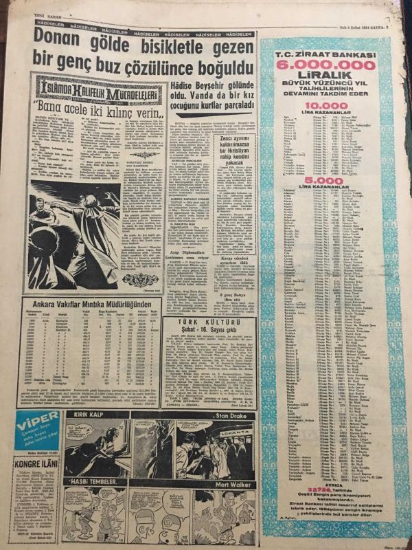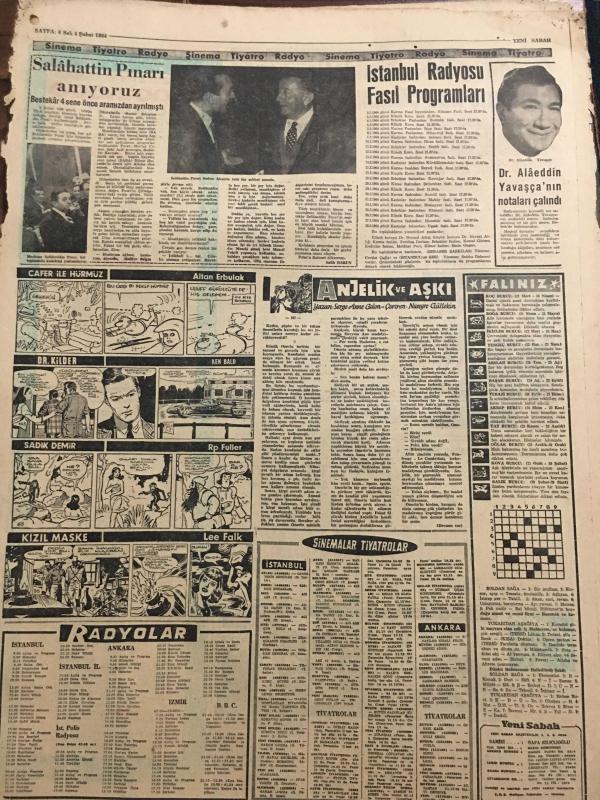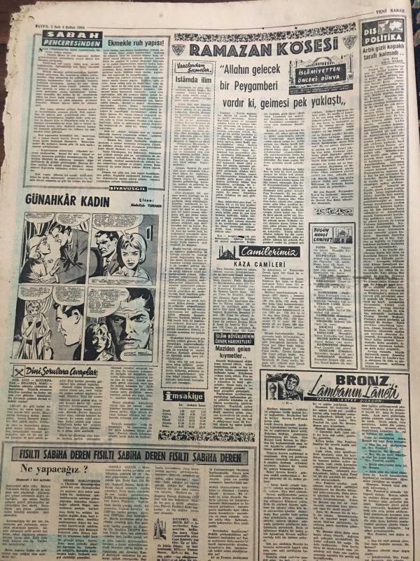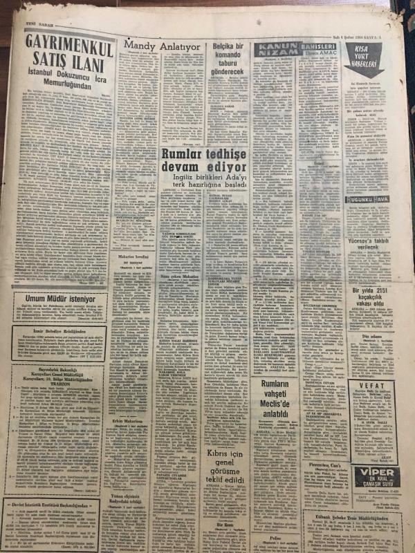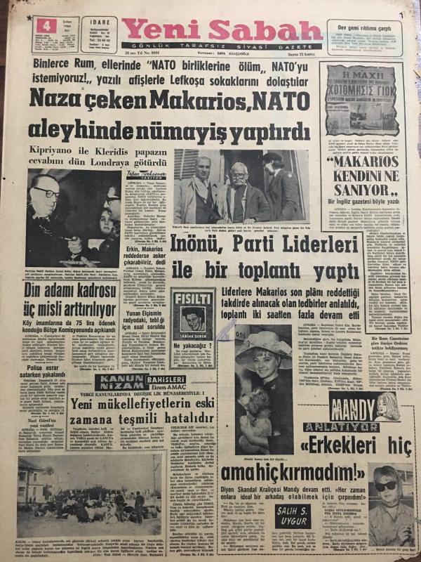YENİ SABAH GAZETESİ 4 ŞUBAT 1964 YIL :26 SAYI :8944--Naza çeken Makarios ,NATO aleyhinde nümayiş yaptırdı --İnönü ,Parti liderleri ile bir toplantı yaptı --Din adamı kadrosu üç misli arttırılıyor ---Yeni mükellefiyetlerin eski zamana teşmili hatalıdır --Ekmekle ruh yapısı :Siyavuşgil --Donan gölde bisikletle gezen bir genç buz çözülünce boğuldu ---Salahattin Pınarı Anıyoruz --İstanbul Radyosu Fasıl Programları ---Belçika bir komando taburu gönderecek --Usuuğlu : Benim için 2 puan mühim dedi --Ümit takımının namzet kadrosu otuza indirildi ---Fiorentina Can ı yeniden keşfetti ---Ordu Takımı dün Tahran da idman yaptı --Fenerbahçe nin MTK hazırlığı bugün resmen başlıyor ---Polise esrar satarken yakalandı --Yunan Elçisinin radyodaki tebliği için sual soruldu --Erkin ,Makarios reddederse asker çıkarabiliriz dedi --Mandy Anlatıyor :Erkekleri hiç ama hiç kırmadım --- Yıpranma, sararmalar, kupon kesiği ve yırtılmalar zamana bağlı olarak görülebilir.