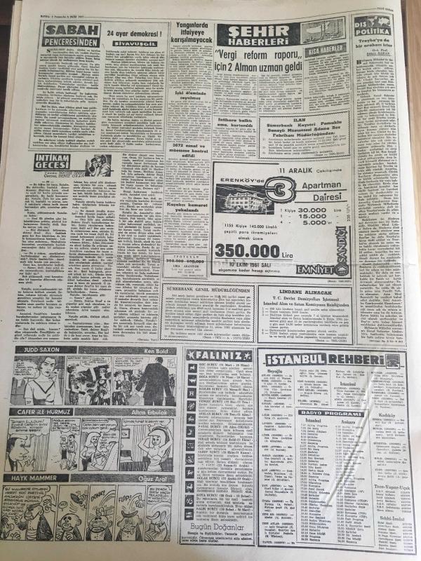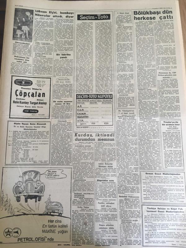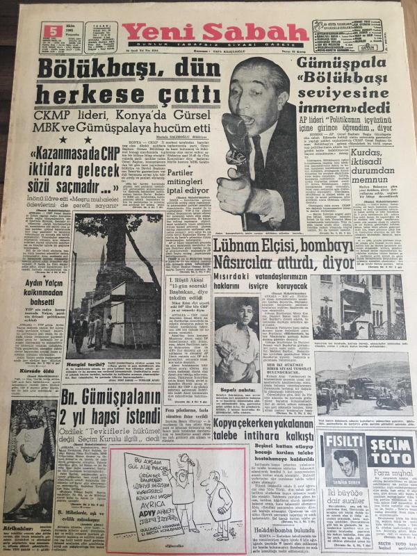 YENİ SABAH GAZETESİ 5 EKİM 1961 YIL :24 SAYI :8104----Bölükbaşı ,dün herkese çattı --Kazanmasalar da CHP İktidara Gelecek Sözü Saçmadır ---Gümüşpala Bölükbaşı Seviyesine İnmem Dedi --Lübnan Elçisi Bombayı Nasırcılar Attırdı ,Diyor --Bn. Gümüşpala 'nın 2 yıl hapis istendi --Aydın Yalçın Kalkınmadan Bahsetti --24 ayar demokrasi :Siyavuşgil --Vergi reform raporu için 2 Alman uzman geldi --Gümüşhane de AP Gümüşpala 'nın yolunu bekliyor --Malatya da seçimleri kim kazanır diye sormak abes --Muğla da da yuvarlak masa AP 'nin çanına ot tıkamış ---Fenerbahçe Nurnberg maçı 18 Ekim de --Bölükbaşı seyahati hadiseli başladı ---Basketbol Federasyonu Belediye yi İtham Ediyor -- Yıpranma, sararmalar, kupon kesiği ve yırtılmalar zamana bağlı olarak görülebilir.