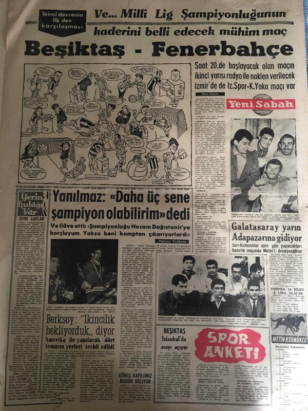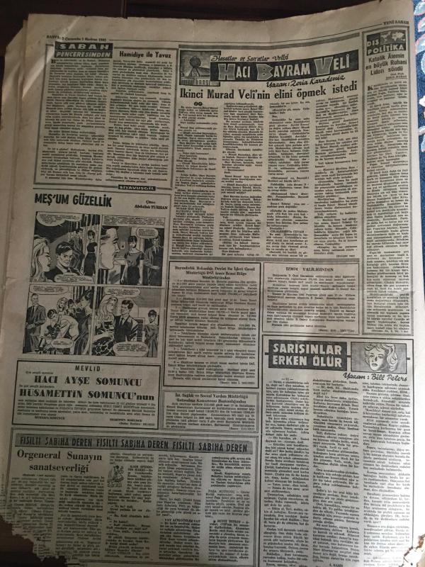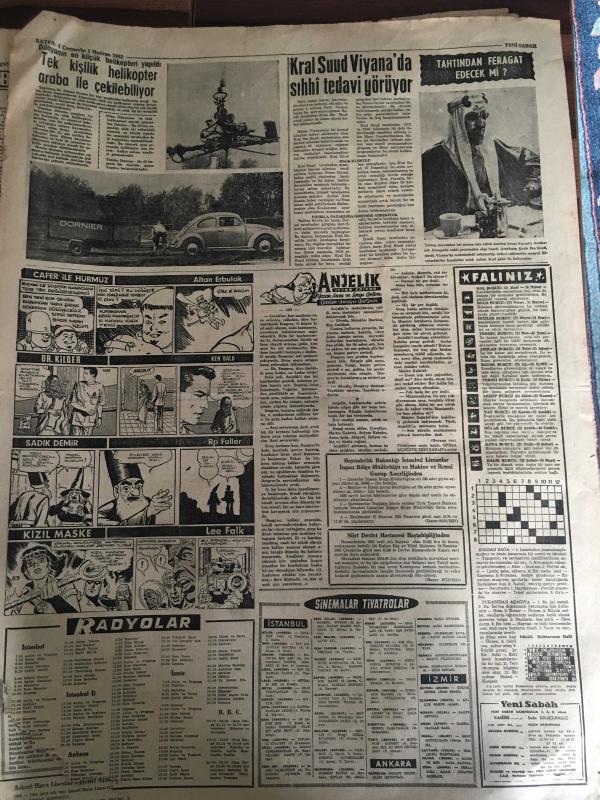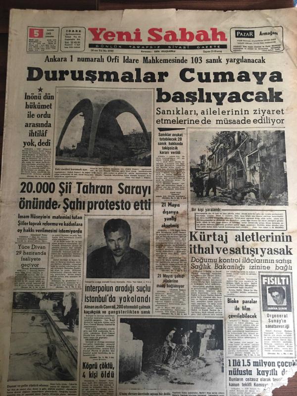YENİ SABAH GAZETESİ 5 HAZİRAN 1963 YIL :26 SAYI :8702--Duruşmalar cumaya başlayacak ---İnönü dün hükümet ile ordu arasında ihtilaf yok dedi --20.000 Şii Tahran Sarayı Önünde ,Şahı Protesto Etti --Kürtaj aletlerinin ithal ve satışı yasak --İnterpolun aradığı suçlu İstanbul da yakalandı --Köprü çöktü 4 kişi öldü ---Hamidiye ile Yavuz : Siyavuşgil --Konya müzesinden değerli eşya çalındı ---Kasırga kurbanları dün 50.000 e yükseldi ---Bursa da yıldırımdan 4 kişi öldü ---Kral Suud Viyana da Sıhhı Tedavi Görüyor --Beşiktaş -Fenerbahçe --Yanılmaz :Daha üç sene şampiyon olabilirim dedi ---Berksoy :İkincilik bekliyorduk diyor ---Galatasaray yarın Adapazarı na gidiyor --Yüce Divan 29 Haziran da Faaliyete Geçiyor --21 Mayıs şehit ailelerine maaş bağlanıyor ---21 Mayıs Dışarıya Yanlış Aksetmiş --Bloke paralar ile film çevirebilecek -- Yıpranma, sararmalar, kupon kesiği ve yırtılmalar zamana bağlı olarak görülebilir.