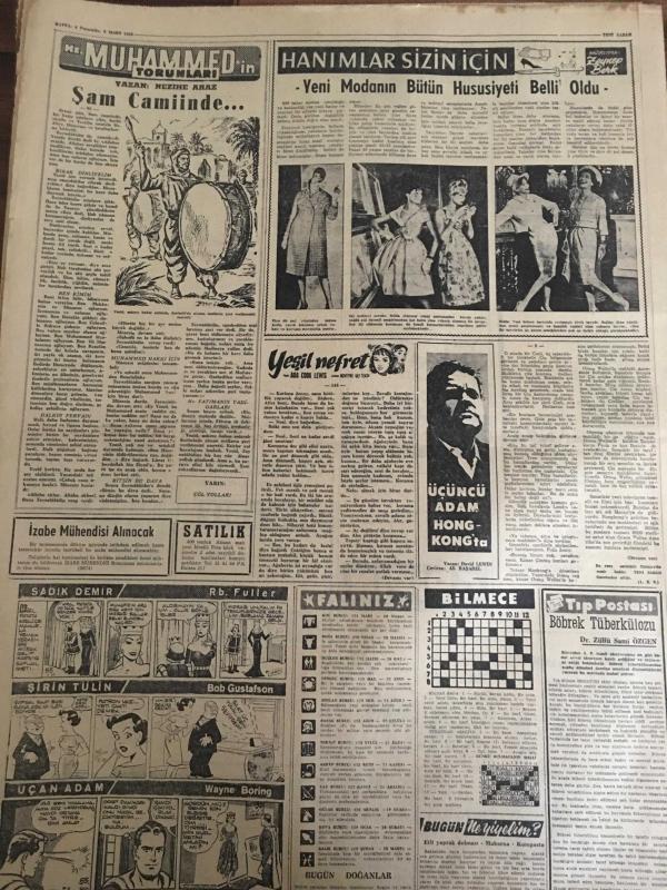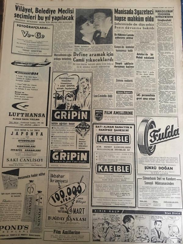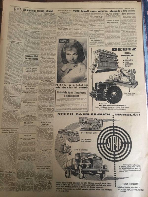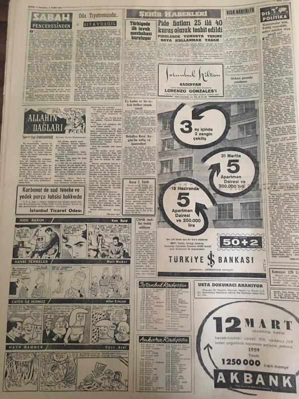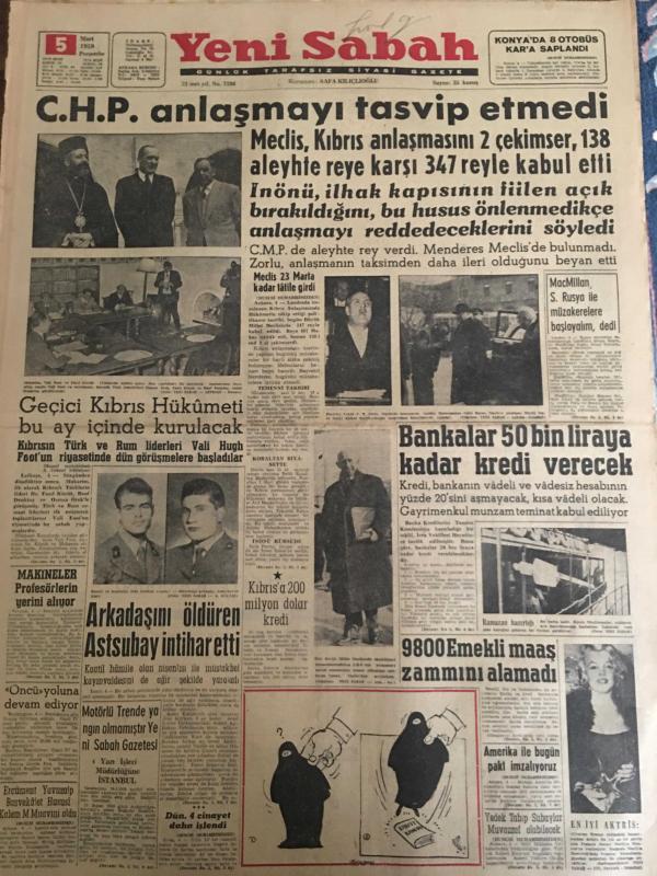 YENİ SABAH GAZETESİ 5 MART 1959 YIL :21 SAYI :7186---CHP anlaşmayı tasvip etmedi ---Geçici Kıbrıs Hükümeti Bu Ay İçinde Kurulacak ---Bankalar 50 bin liraya kadar kredi verecek --Arkadaşını öldüren astsubay intihar etti ---9800 Emekli maaş zammını alamadı --Kıbrıs a 200 milyon dolar kredi ---Oda Tiyatrosunda :Siyavuşgil --Pide fiyatları 25 ila 40 kuruş olarak tespit edildi ---Radyo Programları ---Vilayet Belediye Meclisi Seçimleri Bu Yıl Yapılacak --Manisa da 3 gazeteci hapse mahkum oldu --Define aramak için cami yıkacaklardı ---Real Madrid Fenerbahçeli Cana 95.000 Dolar Teklif Etmiş ---Moda ,Galatasaray ı 68-57 mağlup etti --Güreş Sporumuz ve turistik seyahatler ---Kara ve Hava galip geldiler ---Dün 4 cinayet daha işlendi ---Makineler profesörlerin yerini alıyor --En iyi aktris : Marilyn Monroe --İnönü ,ilhak kapısının fiilen açık bırakıldığını , bu husus önlenmedikçe anlaşmayı reddedeceklerini söyledi --- Yıpranma, sararmalar, kupon kesiği ve yırtılmalar zamana bağlı olarak görülebilir.