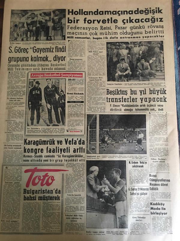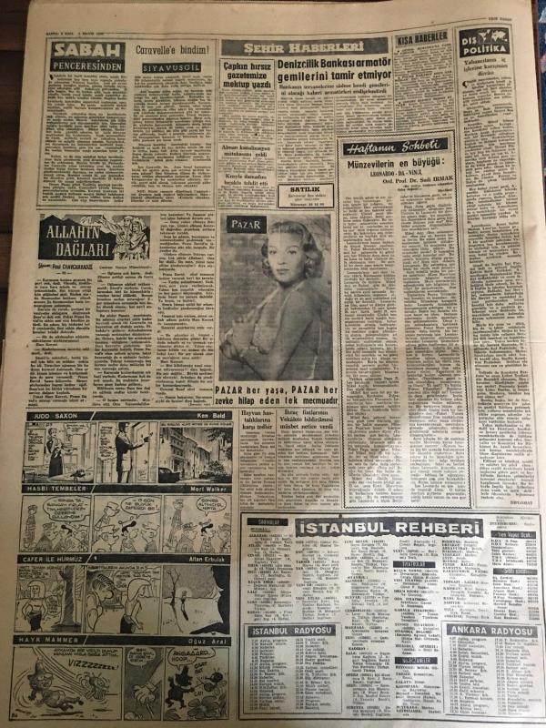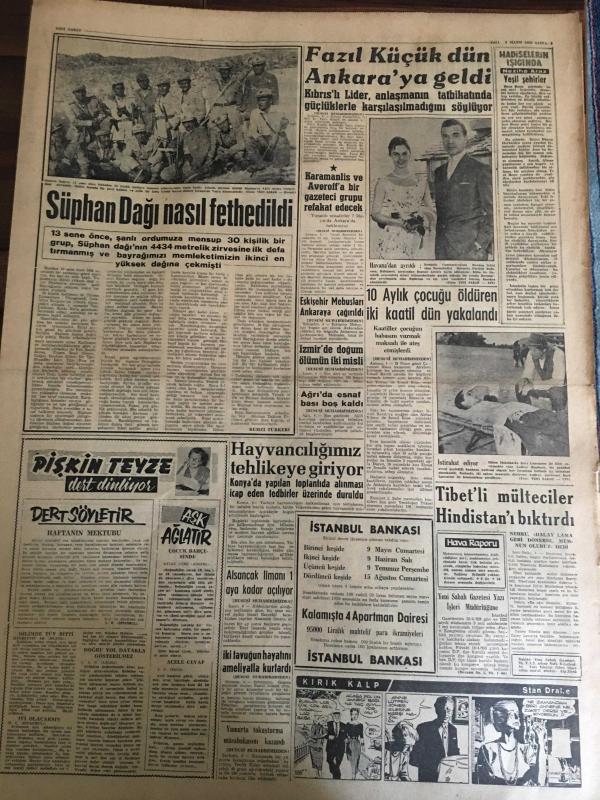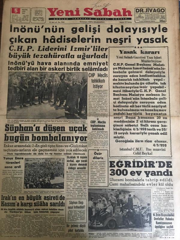 YENİ SABAH GAZETESİ 5 MAYIS 1959 YIL :21 SAYI :7245--İnönü nün gelişi dolayısıyla çıkan hadiselerin neşri yasak----Süphan a düşen uçak bugün bombalanıyor ---Yunus Emre törenleri sona erdi ----Irak ın büyük aşireti de Kasım a karşı silaha sarıldı --Eğridir de 300 ev yandı ---Bir jetimiz düştü pilot kurtuldu ---Caravelle e bindim :Siyavuşgil ----İstanbul Rehberi --Fazıl Küçük dün Ankara ya geldi --Süphan Dağı nasıl fethedildi --10 Aylık çocuğu öldüren iki katil dün yakalandı ---Tibet li mülteciler Hindistan ı bıktırdı ---Hayvancılığımız tehlikeye giriyor ---Don Murray Yıllarca Sonra Arzusuna Kavuştu ---Hollanda maçına değişik bir forvetle çıkacağız---S.Göreç gayemiz final grubuna kalmak diyor ---Beşiktaş bu yıl büyük transferde yapacak ---Karagümrük ve Vefa da kongre faaliyeti arttı --Kadıköy Moda ile birleşiyor ---Roma Olimpiyatlarına Resmen Davet Edildik --CHP meclis tahkikatı istiyor ---N.Erim Beynelmilel Devletler Hukuku Komisyonun Üyeliğine Seçildi -- Yıpranma, sararmalar, kupon kesiği ve yırtılmalar zamana bağlı olarak görülebilir.