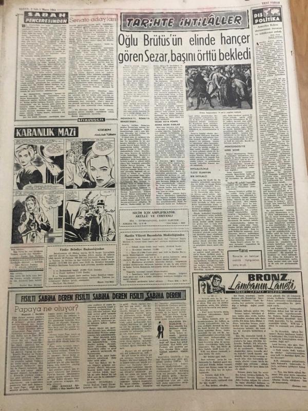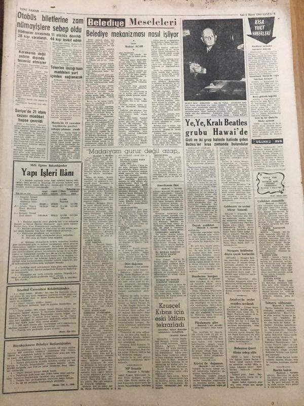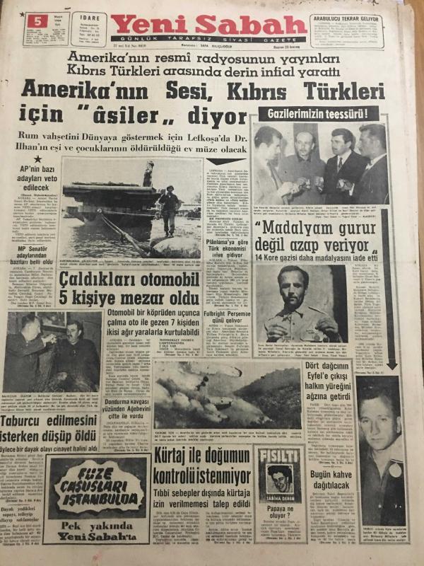 YENİ SABAH GAZETESİ 5 MAYIS 1964 YIL :27 SAYI :9030---Amerika nın Sesi Kıbrıs Türkleri için asiler diyor --AP nin bazı adayları veto edilecek ---Çaldıkları otomobil 5 kişiye mezar oldu ---Madalyam gurur değil azap veriyor ---Taburcu edilmesini isterken düşüp öldü --Kürtaj ile doğumun kontrolü istenmiyor ---Dört dağcının Eyfel e çıkışı halkın yüreğini ağzına getirdi -----Senato adayları : Siyavuşgil ---Sinemalar ,Tiyatrolar ,Radyo Programları ---Bulgaristan da Allahsızlar ile Ortodokslar Çarpıştı ---Mafia nın dehşet dünyası : Yıllık 150 bin dolar kazanç ---Mediha Demirkıran İstanbul a döndü --Naime Batanay ---Otobüs biletlerine zam nümayişlere sebep oldu --Belediye mekanizması nasıl işliyor ---Galatasaray Ankara da PTT ile Oynuyor ---Ümitler Yarın Kampa Giriyor ---Şampiyonanın sayı kralı Franklin oldu ---Sağnak :Hakem bütün ümidimizi köstekledi dedi ---Ad.Demirspor hadiseli maç için Danıştay a başvuruyor --MP Senatör Adaylarından Bazıları Belli Oldu ----- Yıpranma, sararmalar, kupon kesiği ve yırtılmalar zamana bağlı olarak görülebilir.