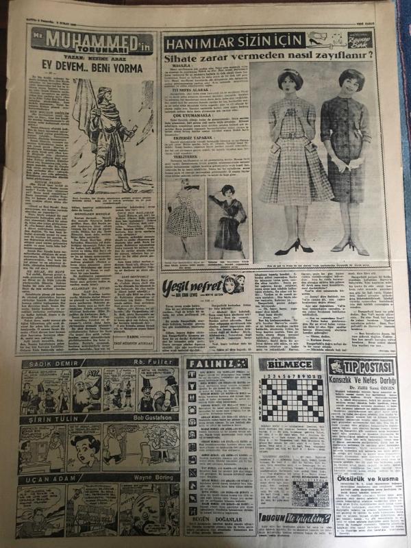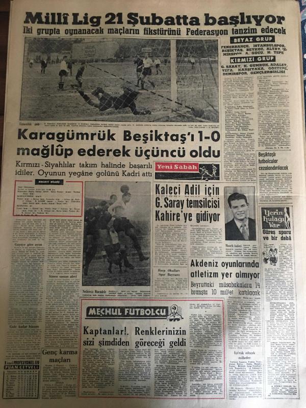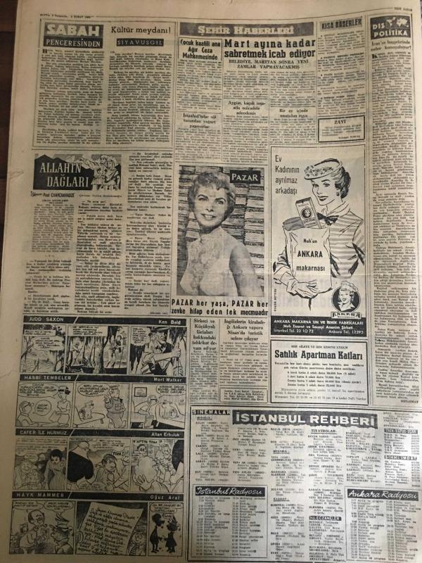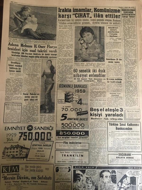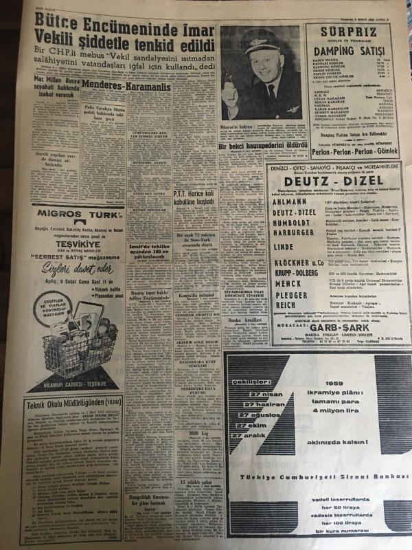 YENİ SABAH GAZETESİ 5 ŞUBAT 1959 YIL :21 SAYI :7158--Menderes ,Karamanlisle yarın Zürih de görüşecek --Polis Tarabya metropolidi hakkında takibata geçti --Zonguldak limanında bir şilep batmak üzere ---15 Silahlı şahıs bir trenden kadın kaçırdı ---Bir bekçi adliye önünde kayınpederini öldürdü --Bir gazeteci daha dün mahkum oldu --72 lik kadın ikiz çocuk doğurdu ---Kültür Meydanı :Siyavuşgil --İstanbul Rehberi ---Irak ta imamlar ,Komünizme karşı CİHAT ile ettiler --60 senelik iki aşık nihayet evlendiler ---Beş el ateşle 3 kişiyi yaraladı ---Bütçe Encümeninde imar vekili şiddetle tenkid edildi --Milli lig 21 Şubat ta başlıyor --Karagümrük Beşiktaş ı 1-0 Mağlup Ederek Üçüncü Oldu ---Kaleci Adil için Galatasaray temsilcisi Kahire ye gidiyor --Akdeniz oyunlarında atletizm yer almıyor --Basına isbat hakkı adliye--Sucuk yapılan yerde domuz eti bulundu --Bir uçak 73 yolcu ile Newyork civarına düştü--Banka kredileri kar hadlerine göre ayarlanacak -- Yıpranma, sararmalar, kupon kesiği ve yırtılmalar zamana bağlı olarak görülebilir.