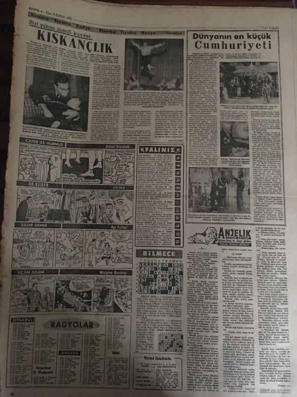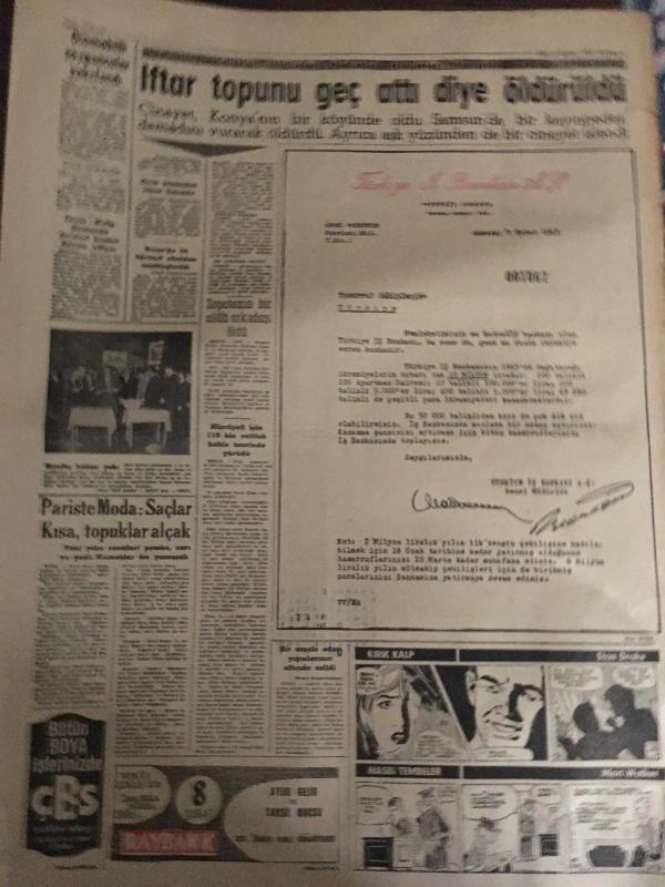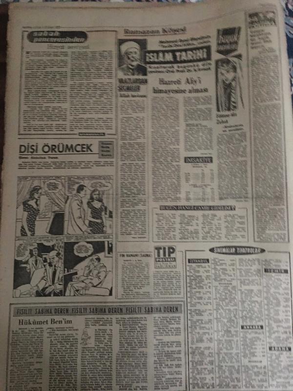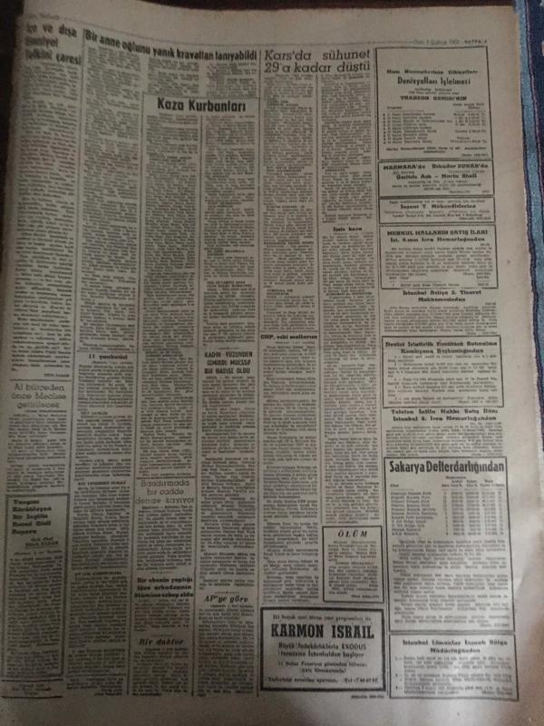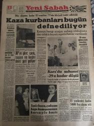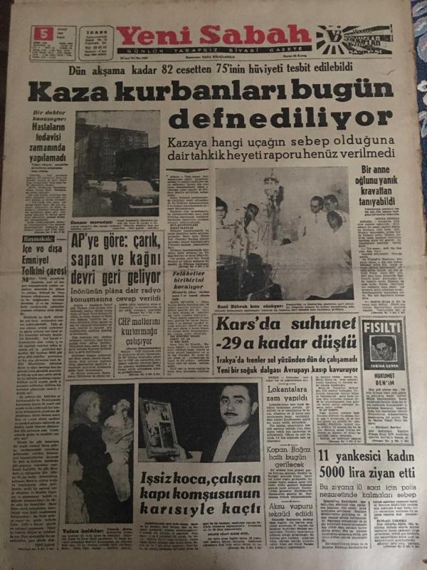 YENİ SABAH GAZETESİ 5 ŞUBAT 1963 YIL :25 SAYI :8587--Kaza kurbanları bugün defnediliyor --AP ye göre : Çarık ,sapan ve kağnı devri geri geliyor --Bir anne oğlunu yanık kravattan tanıyabildi --Kars da suhunet -29 a kadar düştü ---İşsiz koca çalışan kapı komşunun karısıyla kaçtı ---11 Yankesici kadın 5000 lira ziyan etti---Hayat seviyesi : Siyavuşgil --İftar topunu geç attı diye öldürüldü --İtalyanlar B Kadro ile Geliyorlar --Davis Kupasındaki Rakibimiz : İsrail ---Beşiktaş bu hafta Ankara deplasmanına çıkacak --M.Paşa Stadına Bir Revir Kuruluyor --Fenerbahçe ,stad için proje hazırlıyor ---CHP Mallarını kurtarmağa çalışıyor --Kopan Boğaz Hattı Bugün Gerileyecek ---Dün akşama kadar 82 cesetten 75 inin hüviyeti tespit edilebildi -- Yıpranma, sararmalar, kupon kesiği ve yırtılmalar zamana bağlı olarak görülebilir.