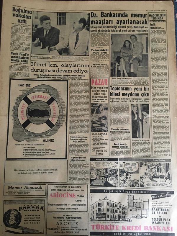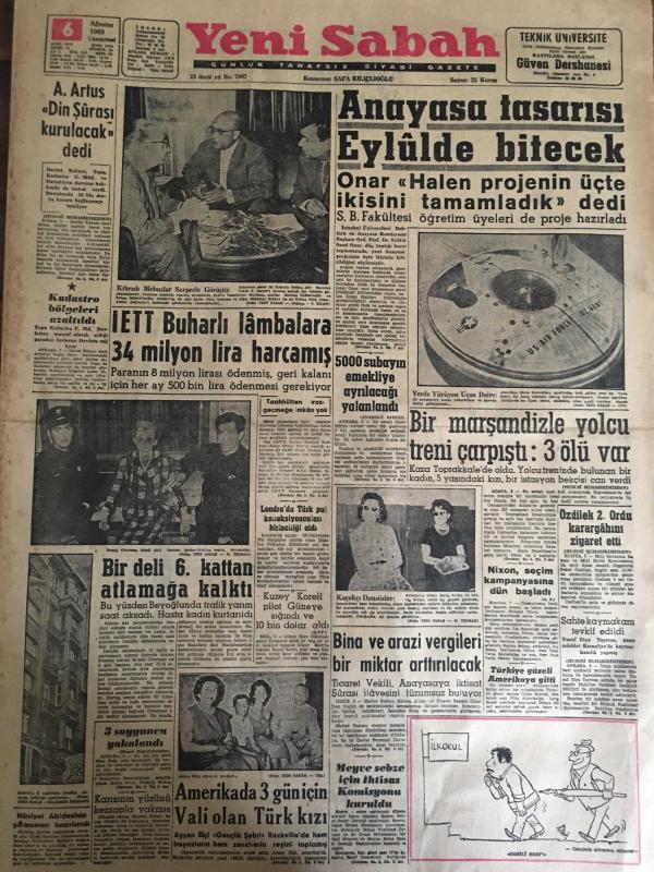 YENİ SABAH GAZETESİ 6 AĞUSTOS 1960 YIL :23 SAYI :7687---A.Artus Din Şurası Kurulacak Dedi --Anayasa tasarısı eylül de bitecek --İETT Baharlı Lambalara 34 Milyon Lira Harcamış ---Bir deli 6 kattan atlamağa kalktı ---5000 subayın emekliye ayrılacağı yalanlandı ---Bir marşandizle yolcu treni çarpıştı :3 ölü var --Bina ve arazi vergileri bir miktar artırılacak --Amerika da 3 gün için vali olan Türk kızı ---48 Bin lira tazminatla :Siyavuşgil ---Radyo Programları ---Boğulma vakaları arttı --Dz.Bankasında memur maaşları ayarlanacak ---31 .km olaylarının duruşması devam ediyor --Toptancının yeni bir hilesi meydana çıktı ---Sinema :Önümüzdeki sezon bu filmleri görecek miyiz ?--Fenerbahçe K.Gümrük --M.Paşa stadına 26 bin kişilik ilave tribün inşaatı başlıyor ---Binicilerin yeni başarısı Yzb.Nail Gönenli birinci ---Fenerbahçe Ergun a bir ay boykot verdi --Bari ve Gürel bugün finali oynuyorlar --- Yıpranma, sararmalar, kupon kesiği ve yırtılmalar zamana bağlı olarak görülebilir.