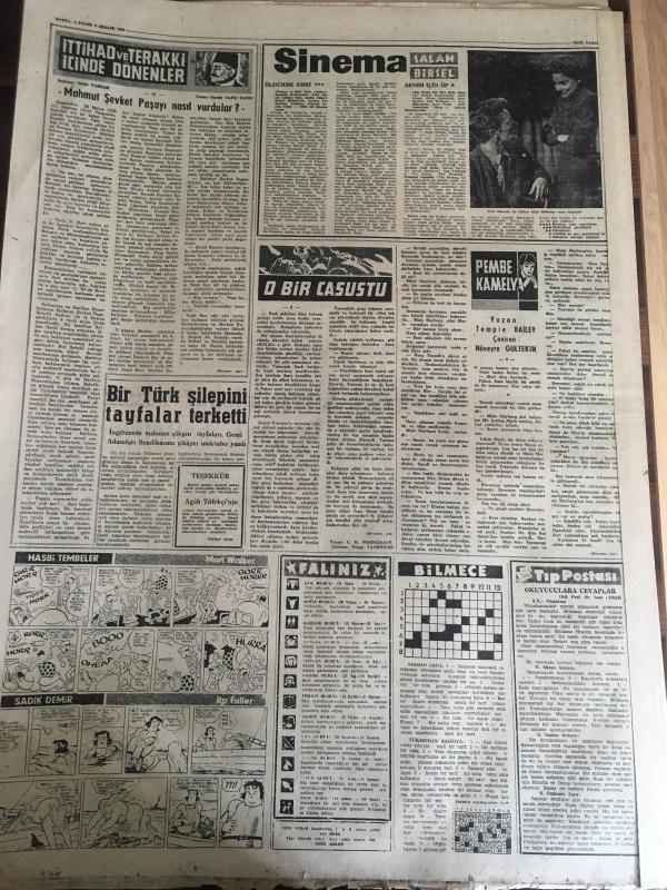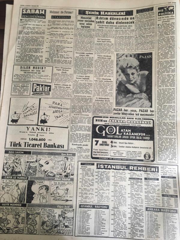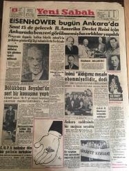 YENİ SABAH GAZETESİ 6 ARALIK 1959 YIL :22 SAYI : 7457---Eisenhower bugün Ankara da ---Başkanla mülakat için gündem tesbit edilmedi ---İnönü aldığımız mesafe ehemmiyetlidir dedi ---Bölükbaşı Boyabat da sert bir konuşma yaptı ----Ankara caddesinde bir mağaza soyuldu --CHP li kadınlar dün polisle tartışlar ---Başkanın müşavirleri ---Mehmet ile Fatma : Siyavuşgil --Rıhtım davasında on şahit daha dinlenecek ----Sinemalar ,Tiyatrolar ,Radyo Programcıları ---Amerika da Kürtaj Yapan Bir Şebeke Meydana Çıkarıldı --Bazı hile baz tacirler ihracatı baltalıyor ---Güney Koreli Gazeteciler Basın Hürriyeti İstiyor ----Tanar 'ı batıran Rus şilepine dün haciz kondu ---Sinemalar : Öldürme Emri, Benim İçin Öp ----Türkiye -Irak Amatör Milli Maçı Bugün Oynanıyor ---Fenerbahçe ,Nice 'in sert futbolundan şikayetçi ---I.Spor ,Altay 'ı 3-2 mağlup etti ---Feriköy :2 D.Spor :1 --CHP İl Merkezi İstimlak Ediliyor ---Eisenhower ın Roma temasları --- adlı eser, Kitap > Süreli Yayınlar > Gazeteler > Türkiye > Genel > Günlük kategorisinde İkinci El olarak satıştadır.