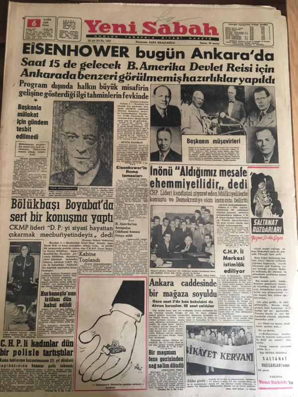 YENİ SABAH GAZETESİ 6 ARALIK 1959 YIL :22 SAYI : 7457---Eisenhower bugün Ankara da ---Başkanla mülakat için gündem tesbit edilmedi ---İnönü aldığımız mesafe ehemmiyetlidir dedi ---Bölükbaşı Boyabat da sert bir konuşma yaptı ----Ankara caddesinde bir mağaza soyuldu --CHP li kadınlar dün polisle tartışlar ---Başkanın müşavirleri ---Mehmet ile Fatma : Siyavuşgil --Rıhtım davasında on şahit daha dinlenecek ----Sinemalar ,Tiyatrolar ,Radyo Programcıları ---Amerika da Kürtaj Yapan Bir Şebeke Meydana Çıkarıldı --Bazı hile baz tacirler ihracatı baltalıyor ---Güney Koreli Gazeteciler Basın Hürriyeti İstiyor ----Tanar 'ı batıran Rus şilepine dün haciz kondu ---Sinemalar : Öldürme Emri, Benim İçin Öp ----Türkiye -Irak Amatör Milli Maçı Bugün Oynanıyor ---Fenerbahçe ,Nice 'in sert futbolundan şikayetçi ---I.Spor ,Altay 'ı 3-2 mağlup etti ---Feriköy :2 D.Spor :1 --CHP İl Merkezi İstimlak Ediliyor ---Eisenhower ın Roma temasları --- Yıpranma, sararmalar, kupon kesiği ve yırtılmalar zamana bağlı olarak görülebilir.