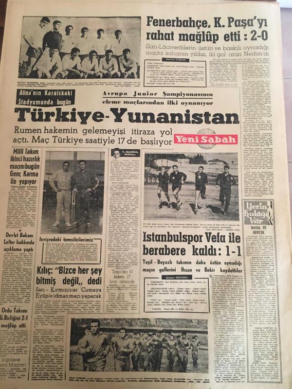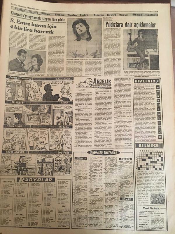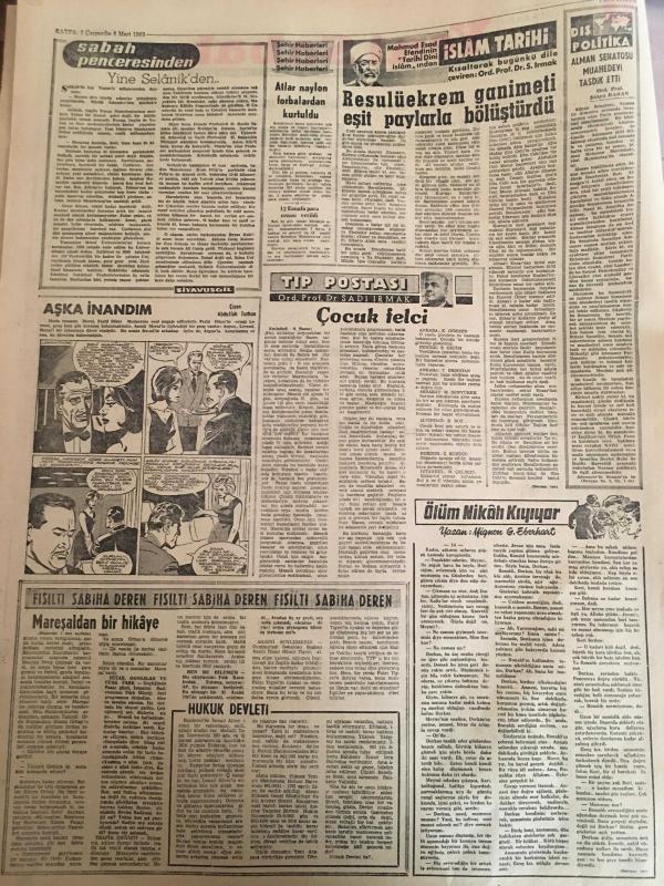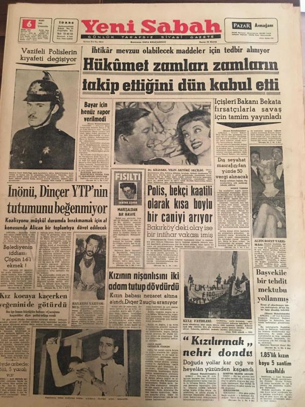 YENİ SABAH GAZETESİ 6 MART 1963 YIL :25 SAYI :8614---Vazifeli Polislerin Kıyafeti Değişiyor --Hükümet zamları zamların takip ettiğini dün kabul etti --İnönü ,Dinçer YTP nin tutumunu beğenmiyor ---Polis bekçi kaatili olarak kısa boylu bir caniyi arıyor ---Kız kocaya kaçarken yeğenini de götürdü --Kızının nişanlısının iki adam tutup dövdürdü ---Başvekile bir tehdit mektubu yollamış --Kızılırmak nehri dondu ---Irak ta Mısır la birleşmek için kuvvetli bir ceryan var ---Kendisine çekilen bıçağı kaptı ve hasmını öldürdü ---De Gaulle e suikast hazırlayanların 6 sı idama mahkum oldu ---Sinema Tiyatro --Kleopatra yı oynamak isteyen Türk yıldızı :Sevim Emre burnu için 4 bin lira harcadı ---Fransa da Amerika ya borç verdi ---Fenerbahçe ,K.Paşa yı rahat mağlup etti :2-0 --Türkiye -Yunanistan --Milli Takım ikinci hazırlık maçını bugün genç karma ile yapıyor --İstanbul spor Vefa ile berabere kaldı :1-1--Kılıç : Bizce her şey bitmiş değil dedi --- Yıpranma, sararmalar, kupon kesiği ve yırtılmalar zamana bağlı olarak görülebilir.
