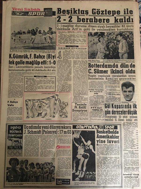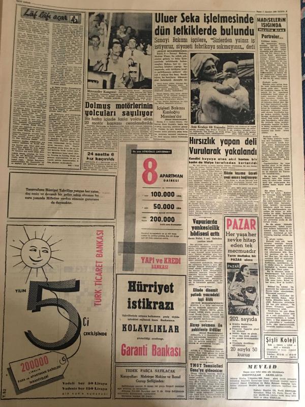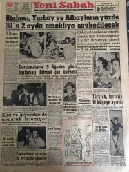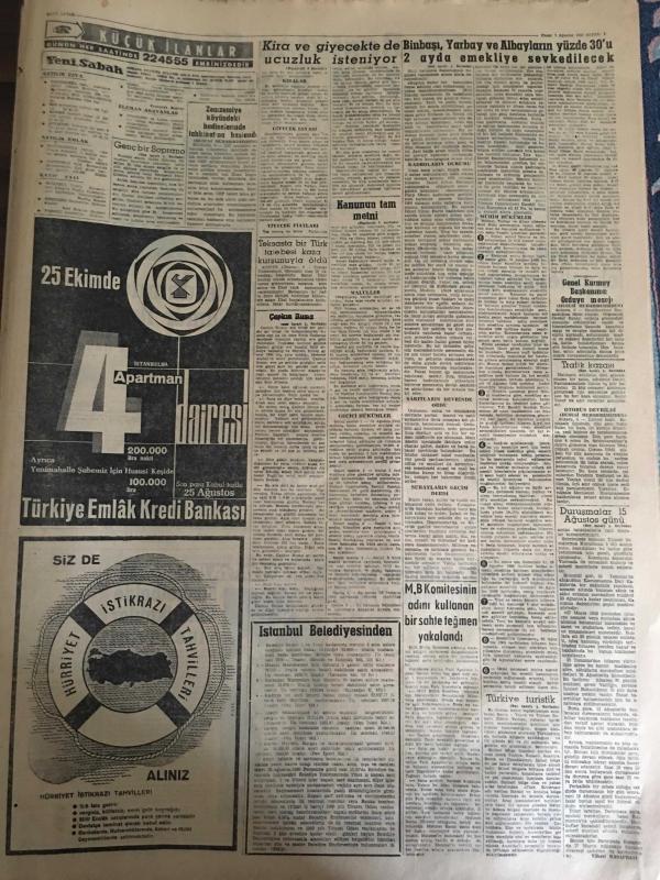 YENİ SABAH GAZETESİ 7 AĞUSTOS1960 YIL :23 SAYI :7688--Binbaşı ,Yarbay ve Albayların yüzde 30 u 2 ayda emekliye sev edildi --7 Radyo istasyonu kuruluyor --Duruşmaların 15 Ağustos günü başlaması ihtimali çok kuvvetli ---Kira ve giyecekte de ucuzluk isteniyor ---Bölükbaşı Ankara ya dönüyor ---Türkiye ,turistik 10 bölgeye ayrıldı --Çapkın hırsız soyduğu üç evi polise gösterdi --İki trafik kazasında 6 kişi öldü ----Geçmişten ibret :Siyavuşgil --İstanbul Rehberi ---Uluer Seka İşletmesinde Dün Tetkiklerde Bulundu --Hırsızlık yapan deli vurularak yakalandı ---Fransız kadınları aşka dair düşüncelerini söylediler ---Beşiktaş Göztepe ile 2-2 berabere kaldı --K.Gümrük ,Fenerbahçe yi tek golle mağlup etti :1-0---Rotterdam dün de C.Sümer ikinci oldu --Tenis de N.Barı Şampiyon --Gül Kupasında ilk gün dereceler düşük ---MB Komitesinin adını kullanan bir sahte teğmen yakalandı --