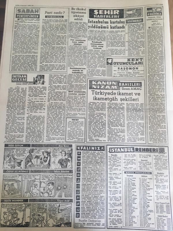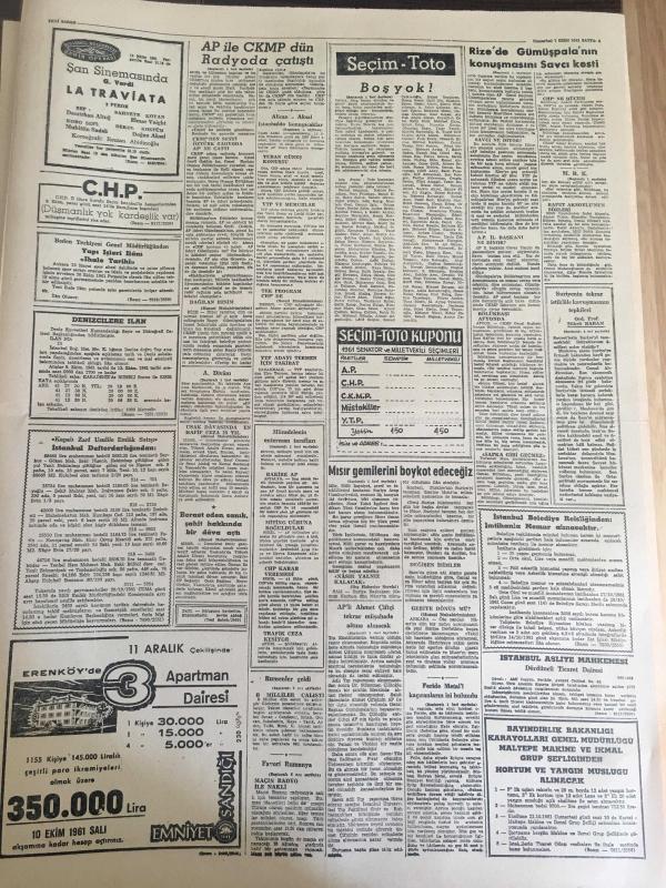 YENİ SABAH GAZETESİ 7 EKİM 1961 YIL :24 SAYI :8166---Rize de Gümüşpala 'nın konuşmasını savcı kesti --Adalet Divanının Çalışmağa Başlaması Gecikiyor --AP ile CKMP Dün Radyo da Çatıştı --Mısır Gemilerini Boykot Edeceğiz --AP 'li Ahmet Çiftçi Tekrar Müşahede Altına Alınacak --Parti nedir ? Siyavuşgil --İstanbul 'un Kurtuluş Yıldönümü Kutlandı --İçel 'in Parolası :Kardeşçe Mücadele -- Çorum da CHP işi sıkı tutuyor --Kastamonu da şanslar denk --Sinema :Kızgın Güneş ,Aşk Mevsimi ,Japon Gülü ---AP ile CKMP dün Radyo da Çatıştı --Bükreş de Favori :Rumanya ---Rumenler dün geldi --Galatasaray Niyazi ,Cenap ve Samim Kadro Harici --Dünkü seçmelerde beş güreşçi elendi -- Yıpranma, sararmalar, kupon kesiği ve yırtılmalar zamana bağlı olarak görülebilir.