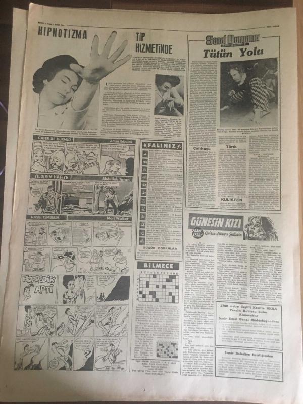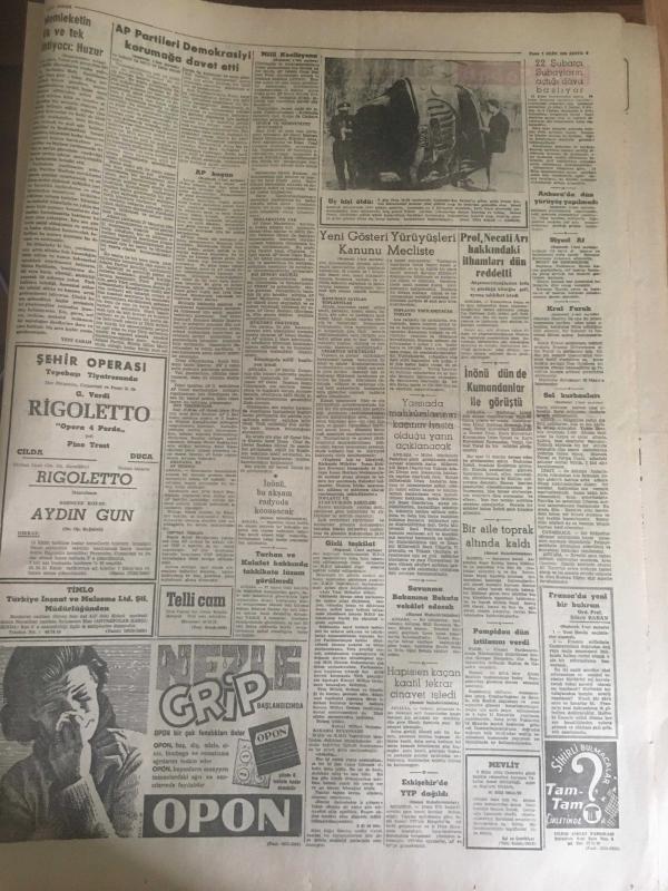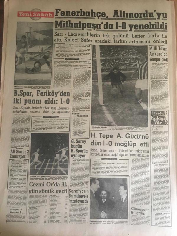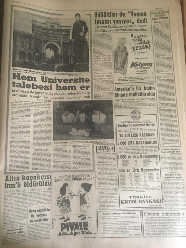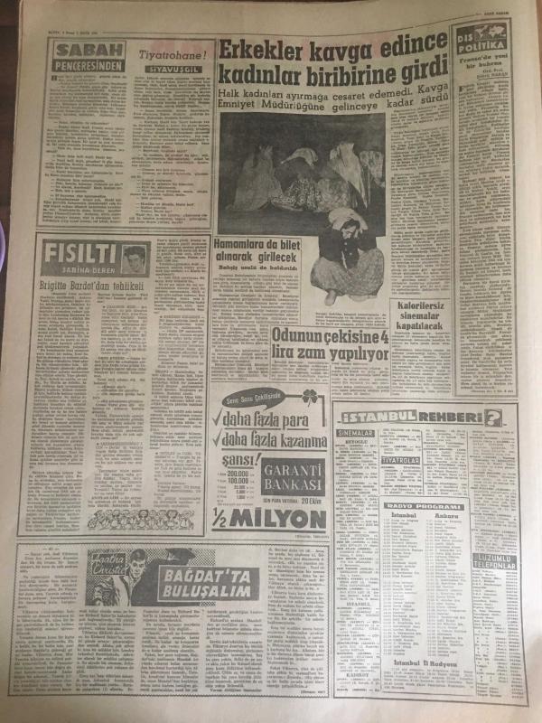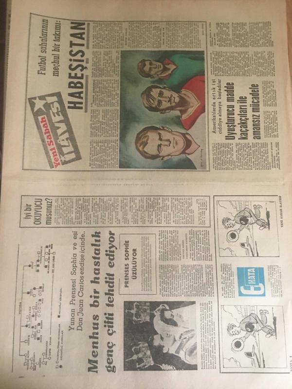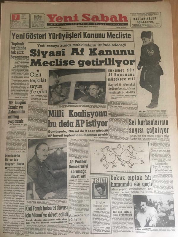 YENİ SABAH GAZETESİ 7 EKİM 1962 YIL :25 SAYI :8466----Yeni Gösteri Yürüyüşleri Kanunu Mecliste --Siyasi Af Kanunu Meclise Getiriliyor ----AP bugün İzmir ve Adana da Miting Yapacak --Milli Koalisyonu Bu Defa AP İstiyor --Sel kurbanlarının sayısı çoğalıyor ---Memleketin ilk ve tek ihtiyacı :Huzur --AP Partileri Demokrasiyi Korumağa Davet Etti ----Dokuz çıplak bir hamamda ele geçti --Kral Faruk hakaret davası için Miami 'ye davet edildi ---Tiyatrohane :Siyavuşgil ---Erkekler kavga edince kadınlar birbirine girdi ---Brigitte Bardot dan tehlikeli ---Menhus bir hastalık genç çifti tehdit ediyor ---Futbol sahalarının meçhul bir takımı :Habeşistan --İhtilalcilerde Yemen İmamı Yaşıyor Dedi --Amerikalı bir kadın Binbaşı Mahkum Oldu --Fenerbahçe ,Altınordu 'yu Mithatpaşa da 1-0 yenebildi --B.Spor ,Feriköy den iki puan aldı :1-0--H.Tepe A.Gücü 'nü dün 1-0 mağlup etti ---Galatasaray bugün K.Spor la oynuyor -- Yıpranma, sararmalar, kupon kesiği ve yırtılmalar zamana bağlı olarak görülebilir.