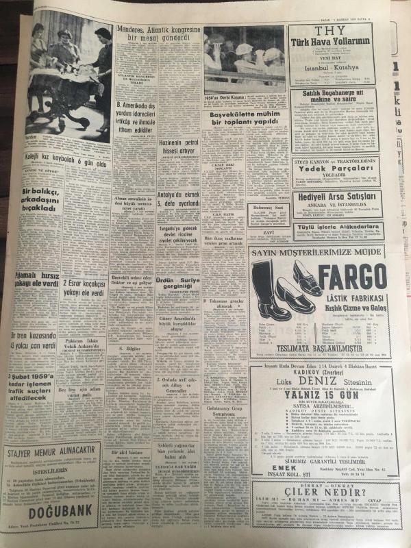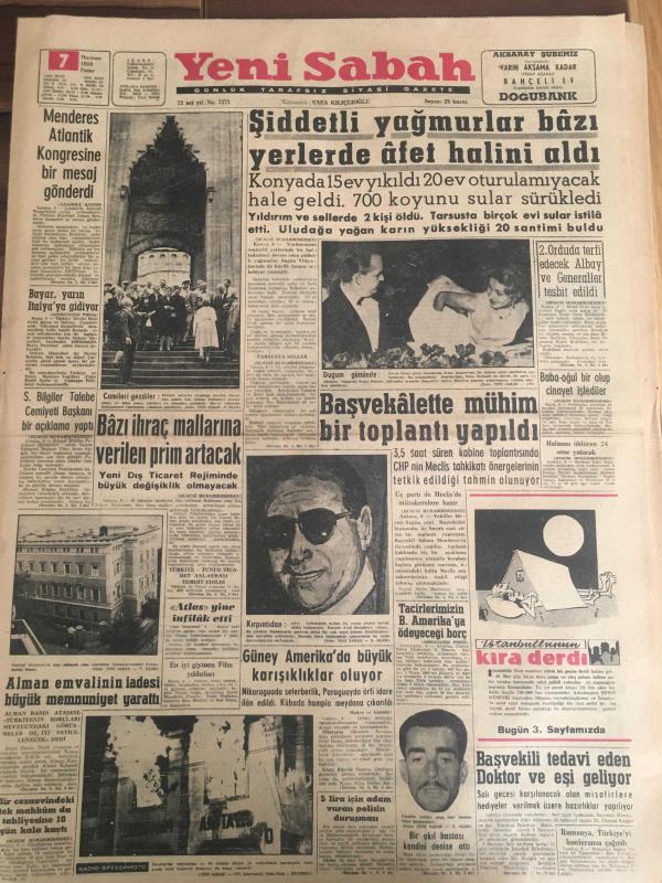 YENİ SABAH GAZETESİ 7 HAZİRAN 1959 YIL :22 SAYI :7278---Menderes Atlantik Kongresine Bir Mesaj Gönderdi--Şiddetli yağmurlar bazı yerlerde afet halini aldı ---Bazı ihraç mallarına verilen prim artacak --Başvekalete mühim bir toplantı yapıldı --Alman emvalinin iadesi büyük memnuniyet yarattı ---Güney Amerika da büyük karışıklıklar oluyor ---Başvekili tedavi eden doktor ve eşi geliyor ---Ziya Paşanın Rüyası :Siyavuşgil --Et meselesinin halli için narhın kalkınması isteniyor ---Cenevre Konferansı Son Safhasına Geldi ---Arnavutluk ve Bulgaristan da Rusya roket üsleri tesis edecek ---Dün bir mensucat fabrikası daha 80 işçisine yol verdi --Bir katil 6 yıl hapis yatacak --Amerika da staj gören altı polisimiz taltif edildi ---Mamie Van Doren Mücadeleden Galip Çıktı ---Galatasaray Grup Şampiyonu --Molnar ,Fenerbahçe antrenörlüğünden dün gece istifa etti --Fenerbahçe -İstanbul Spor Karagümrük -Adalet oynuyor ---Kırkpınar güreşleri bugün sona eriyor --