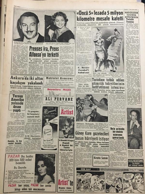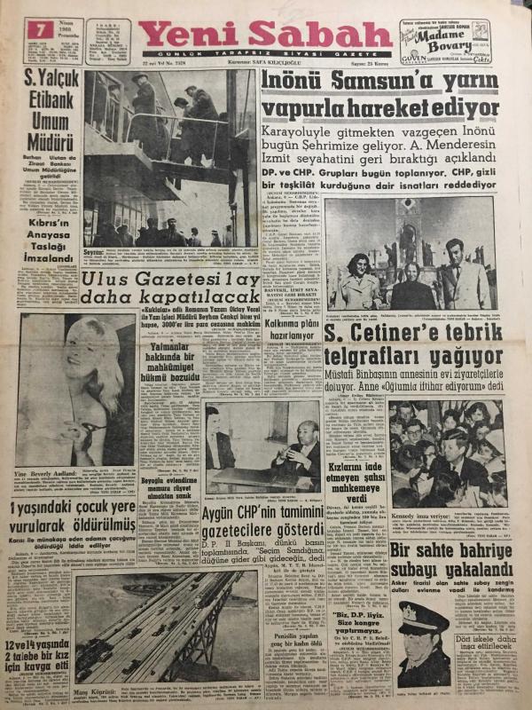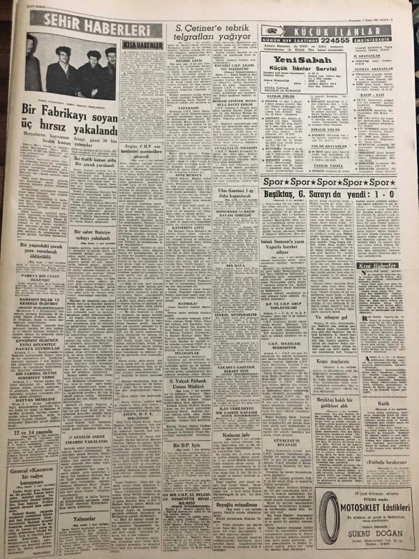 YENİ SABAH GAZETESİ 7 NİSAN 1960 YIL :22 SAYI :7578--S.Yalçuk Etibank Umum Müdürü ---İnönü Samsun a yarın vapurla hareket ediyor ---Kıbrıs ın Anayasa Taslağı İmzalandı --Ulus Gazetesi 1 ay daha kapatılacak ---1 Yaşındaki çocuk yere vurularak öldürülmüş --S.Çetiner e tebrik telgrafları yağıyor ---Aygün CHP nin tamimini gazetecilere gösterdi ---Kızların iade etmeyen şahsı mahkemeye verdi ---Bir sahte bahriye subayı yakalandı ---Devlet Operası İstanbul da :Siyavuşgil ---İstanbul Rehberi ---Öncü 5 fezada 5 milyon kilometre mesafe katetti ---Prenses İra ,Prens Alfonso yu terk etti ---Turistlere tatbik edilen gümrük takyitlerinin hafifletilmesi isteniyor --Ankara da iki altın kaçakçısı yakalandı --Güney Kore de gazetecileri basın hürriyeti istiyor --Beşiktaş ,Galatasaray da yendi :1-0--Kutik Hakkımız olan galibiyeti aldık dedi --Beşiktaş Nasıl Şampiyon Olur ?--Kupa Maçlarını Kulüpler Kabul Etti --Yalmanlar hakkında bir mahkumiyet hükmü bozuldu ---Kalkınma planı hazırlanıyor --- Yıpranma, sararmalar, kupon kesiği ve yırtılmalar zamana bağlı olarak görülebilir.