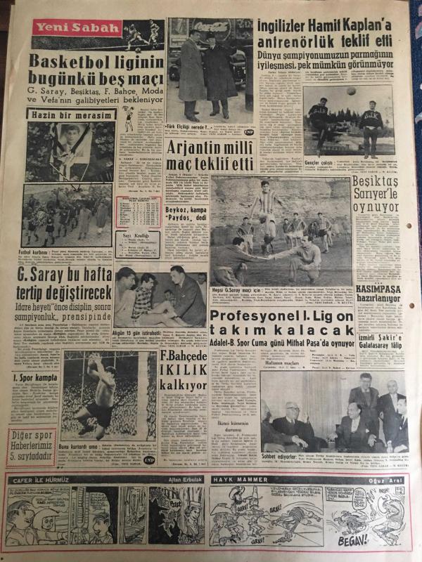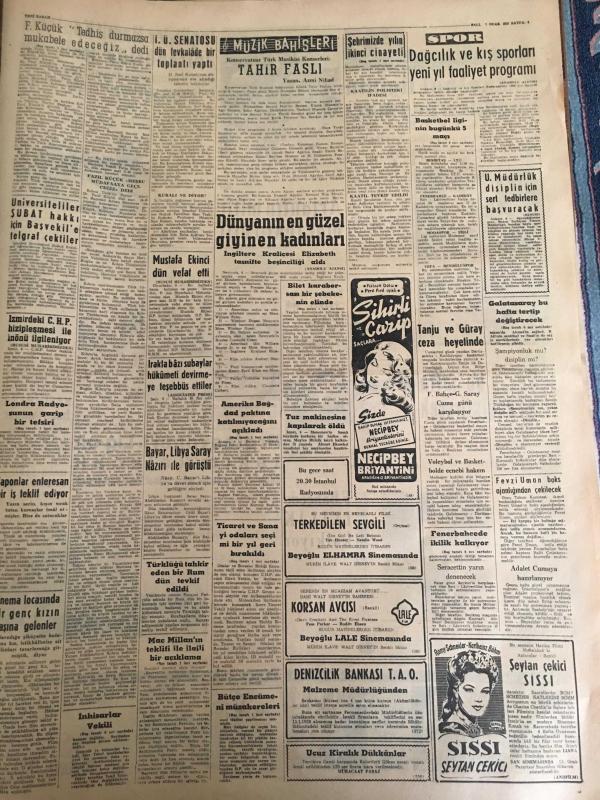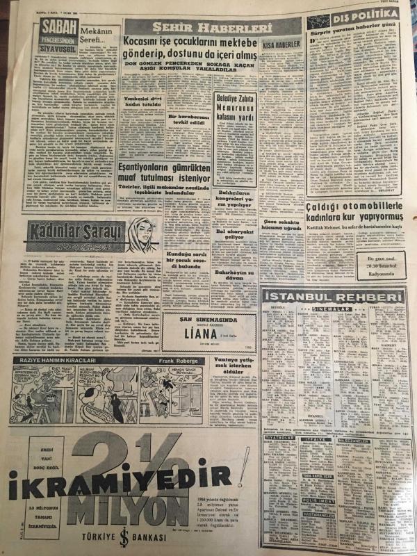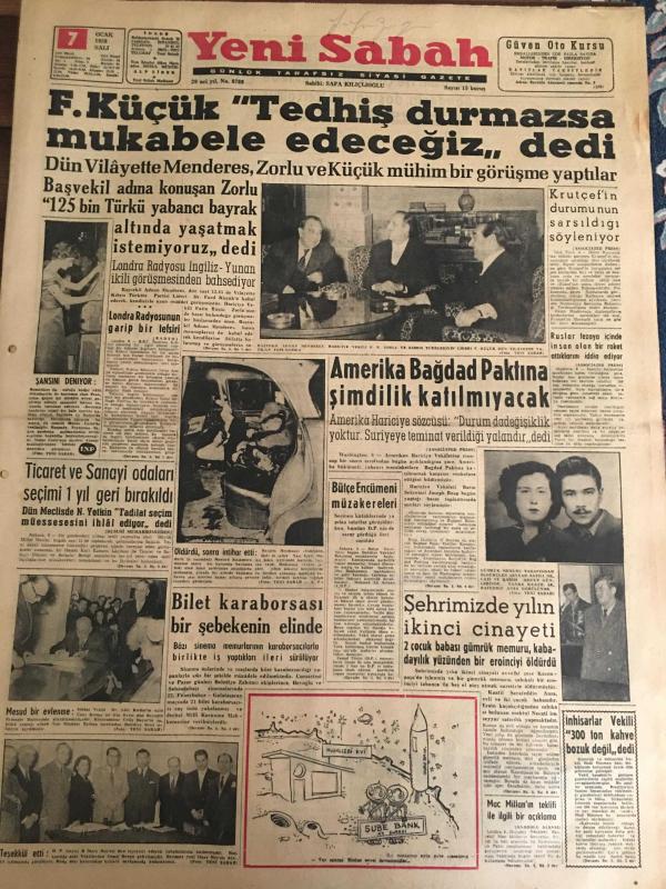 YENİ SABAH GAZETESİ 7 OCAK 1958 YIL :20 SAYI :6769--F.Küçük Tedhiş durmazsa mukabele edeceğiz dedi: Zorlu 125 bin Türkü yabancı bayrak altında yaşatmak istemiyoruz dedi --Ticaret ve Sanayi odaları seçimi 1 yıl geri bırakıldı ---Amerika Bağdat Paktına şimdilik katılmayacak --Bilet karaborsası bir şebekenin elinde --Şehrimizde yılın ikinci cinayeti ---Kocasını işe çocuklarını mektebe gönderip dostunu da içeri almış --İstanbul Rehberi ---DP Geçici İl İdare Kurulu Teşekkül Etti ---Şehri kirletenlerle başa çıkmak imkansız --Genelevlerin şehir dışına nakli işine hız verildi ---İspanya da kadın modası ihraç ediyor ---Basketbol liginin bugünkü beş maçı ---İngilizler Hamit Kaplan a antrenörlük teklif etti ---Galatasaray bu hafta tertip değiştirecek ---Profesyonel . 1 lig on takım kalacak ---Beşiktaş Sarıyer le oynuyor --Fenerbahçe ikilik kalkıyor --Krutçef in durumunun sarsıldığı söyleniyor ---Bütçe encümeni müzakereleri --- Yıpranma, sararmalar, kupon kesiği ve yırtılmalar zamana bağlı olarak görülebilir.