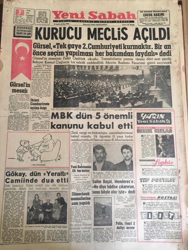 YENİ SABAH GAZETESİ 7 OCAK 1961 YIL :23 SAYI : 7841---Kurucu Meclis Açıldı ---Gürsel in mesajı --İkinci Cumhuriyete Açılan Kapı --MBK dün 5 önemli kanunu kabul etti ---Gökay ,dün yeraltı camiinde dua etti ----Salim Başol Menderes 'e Ne diye hadise çıkarırsın sonu böyle olur işte dedi ---Sosyal Cumhuriyet :Siyavuşgil ---Facianın kahramanları Arşidük Rodolhe ile sevgilisi Marie Vetsera kardeş miydi ?---Sinemalar ,Tiyatrolar ,Radyo Programları ---Kalbi akümülatör çalışan adam hayatından çok memnun ---Sinema : 400 Darbe ,Ölüm Korkusu,---Cezayir de Referandum sakin bir şekilde başladı ---Kadirli yangınında 7 bina yandı ,1 ölü var ----Subaylar yardımlaşma kanunundan memnun---Lig Lideri Galatasaray Çek Tatran Karşısında ---Ordu Takımımız dün kati şeklini aldı ---Bulgar İkinci Levski Dün Geldi ---Galatasaray Bugün ,Fenerbahçe Yarın Kongre Yapacak ---Basketbolda Moda D.Şafaka Oynuyor ---Ankara nın dev takımı :Gençlerbirliği ---- Yıpranma, sararmalar, kupon kesiği ve yırtılmalar zamana bağlı olarak görülebilir.