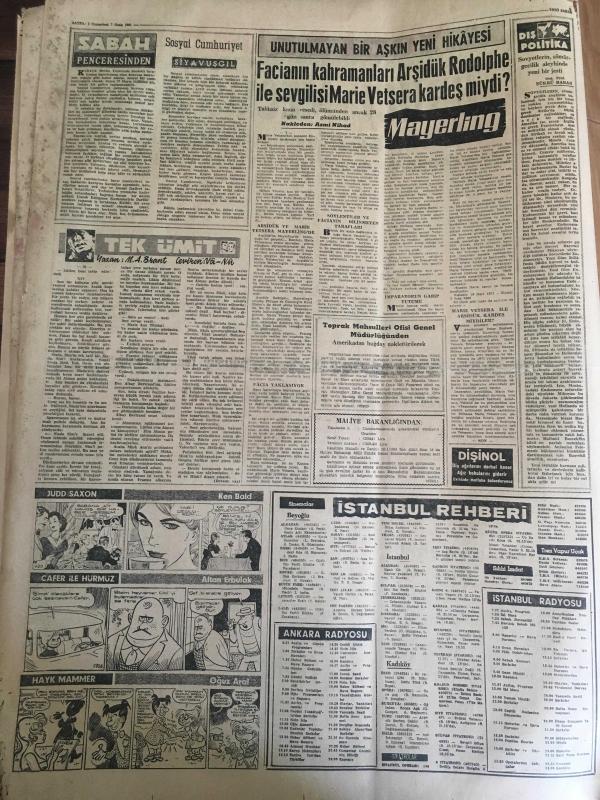 YENİ SABAH GAZETESİ 7 OCAK 1961 YIL :23 SAYI : 7841---Kurucu Meclis Açıldı ---Gürsel in mesajı --İkinci Cumhuriyete Açılan Kapı --MBK dün 5 önemli kanunu kabul etti ---Gökay ,dün yeraltı camiinde dua etti ----Salim Başol Menderes 'e Ne diye hadise çıkarırsın sonu böyle olur işte dedi ---Sosyal Cumhuriyet :Siyavuşgil ---Facianın kahramanları Arşidük Rodolhe ile sevgilisi Marie Vetsera kardeş miydi ?---Sinemalar ,Tiyatrolar ,Radyo Programları ---Kalbi akümülatör çalışan adam hayatından çok memnun ---Sinema : 400 Darbe ,Ölüm Korkusu,---Cezayir de Referandum sakin bir şekilde başladı ---Kadirli yangınında 7 bina yandı ,1 ölü var ----Subaylar yardımlaşma kanunundan memnun---Lig Lideri Galatasaray Çek Tatran Karşısında ---Ordu Takımımız dün kati şeklini aldı ---Bulgar İkinci Levski Dün Geldi ---Galatasaray Bugün ,Fenerbahçe Yarın Kongre Yapacak ---Basketbolda Moda D.Şafaka Oynuyor ---Ankara nın dev takımı :Gençlerbirliği ----, SAFA KILIÇLIOĞLU tarafından kaleme alınmıştır. Kitap 1961 yılında [YENİ SABAH MATBAA] o ISBN kodu ile yayınlanmıştır. 6 sayfadır. YENİ SABAH GAZETESİ 7 OCAK 1961 YIL :23 SAYI : 7841---Kurucu Meclis Açıldı ---Gürsel in mesajı --İkinci Cumhuriyete Açılan Kapı --MBK dün 5 önemli kanunu kabul etti ---Gökay ,dün yeraltı camiinde dua etti ----Salim Başol Menderes 'e Ne diye hadise çıkarırsın sonu böyle olur işte dedi ---Sosyal Cumhuriyet :Siyavuşgil ---Facianın kahramanları Arşidük Rodolhe ile sevgilisi Marie Vetsera kardeş miydi ?---Sinemalar ,Tiyatrolar ,Radyo Programları ---Kalbi akümülatör çalışan adam hayatından çok memnun ---Sinema : 400 Darbe ,Ölüm Korkusu,---Cezayir de Referandum sakin bir şekilde başladı ---Kadirli yangınında 7 bina yandı ,1 ölü var ----Subaylar yardımlaşma kanunundan memnun---Lig Lideri Galatasaray Çek Tatran Karşısında ---Ordu Takımımız dün kati şeklini aldı ---Bulgar İkinci Levski Dün Geldi ---Galatasaray Bugün ,Fenerbahçe Yarın Kongre Yapacak ---Basketbolda Moda D.Şafaka Oynuyor ---Ankara nın dev takımı :Gençlerbirliği ---- adlı eser Türkçe dilindedir.