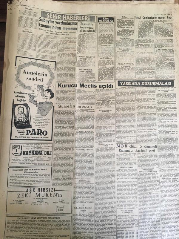 YENİ SABAH GAZETESİ 7 OCAK 1961 YIL :23 SAYI : 7841---Kurucu Meclis Açıldı ---Gürsel in mesajı --İkinci Cumhuriyete Açılan Kapı --MBK dün 5 önemli kanunu kabul etti ---Gökay ,dün yeraltı camiinde dua etti ----Salim Başol Menderes 'e Ne diye hadise çıkarırsın sonu böyle olur işte dedi ---Sosyal Cumhuriyet :Siyavuşgil ---Facianın kahramanları Arşidük Rodolhe ile sevgilisi Marie Vetsera kardeş miydi ?---Sinemalar ,Tiyatrolar ,Radyo Programları ---Kalbi akümülatör çalışan adam hayatından çok memnun ---Sinema : 400 Darbe ,Ölüm Korkusu,---Cezayir de Referandum sakin bir şekilde başladı ---Kadirli yangınında 7 bina yandı ,1 ölü var ----Subaylar yardımlaşma kanunundan memnun---Lig Lideri Galatasaray Çek Tatran Karşısında ---Ordu Takımımız dün kati şeklini aldı ---Bulgar İkinci Levski Dün Geldi ---Galatasaray Bugün ,Fenerbahçe Yarın Kongre Yapacak ---Basketbolda Moda D.Şafaka Oynuyor ---Ankara nın dev takımı :Gençlerbirliği ---- adlı eser, Kitap > Süreli Yayınlar > Gazeteler > Türkiye > Genel > Günlük kategorisinde İkinci El olarak satıştadır.