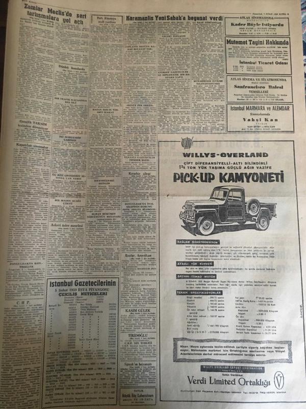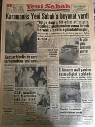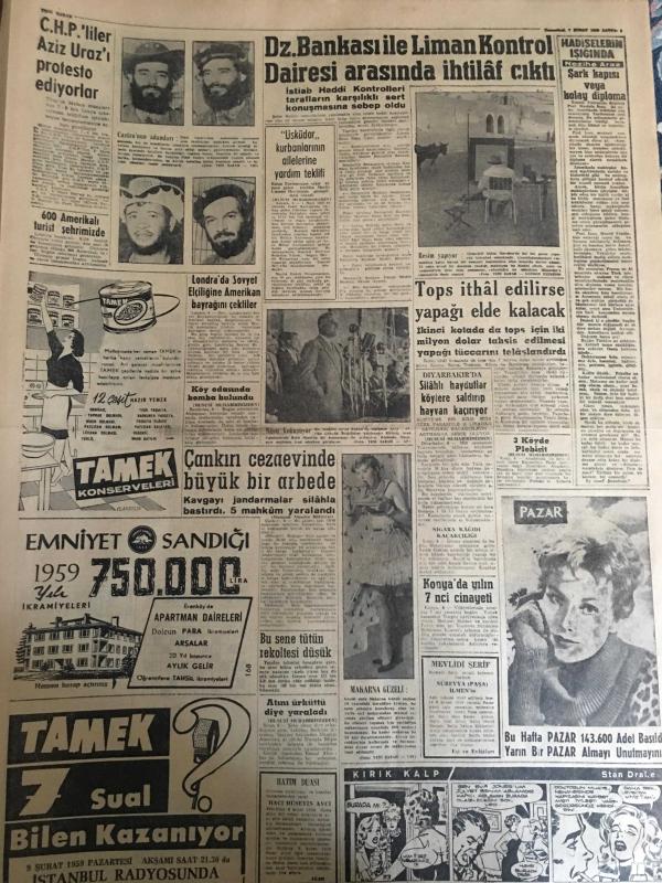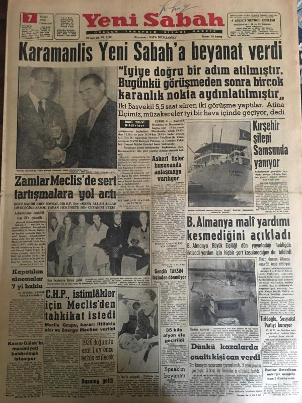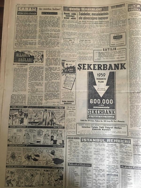 YENİ SABAH GAZETESİ 7 ŞUBAT 1959 YIL :21 SAYI :7160--Karamanlis Yeni Sabah a Beyanat Verdi --Zamlar Meclis de sert tartışmalara yol açtı---CHP istimlak için meclis den tahkikat istedi ---B.Almanya mali yardımı kesmediğini açıkladı ---Dünkü kazalarda on altı kişi can verdi ---Kırşehir şilepi Samsun da yanıyor --İki müthiş haber :Siyavuşvil ---İstanbul Rehberi ---Dz.Bankası ile liman kontrol dairesi arasında ihtilaf çıktı ---Tops ithal edilirse yapağı elde kalacak --Çankırı cezaevinde büyük bir arbede ---Sinema :Kader Böyle İstiyordu ,Sevmek Günah Mı ?----Basketbolda Fenerbahçe D.Şafaka Oynuyor ---Şampiyon namzedi Fenerbahçe B.Spor u rahat yenebilir --Genç karma maçları 8 bölgede başladı ---B.Ahmet ,Gürcan ,Münir kadro harici bırakıldılar ---Turgay Arjantin e orada kalmak kararıyla gitti --Askeri üsler hususunda anlaşmaya varılıyor -- Yıpranma, sararmalar, kupon kesiği ve yırtılmalar zamana bağlı olarak görülebilir.