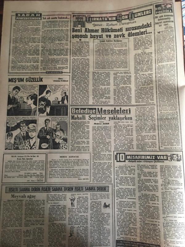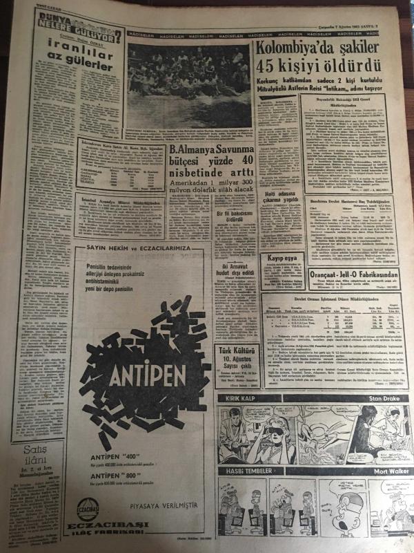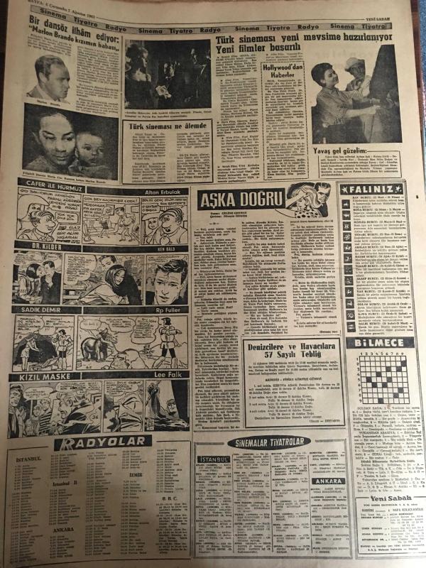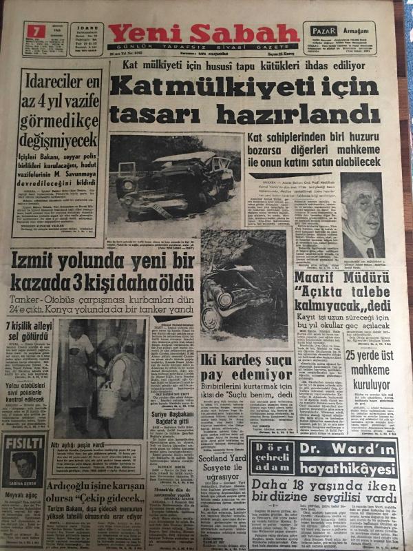 YENİ SABAH GAZETESİ 7AĞUSTOS 1963 YIL :26 SAYI :8763--İdareciler en az 4 yıl vazife görmedikçe değişmeyecek ---Kat mülkiyeti için tasarı hazırlandı ---İzmir yolunda yeni bir kazada 3 kişi daha öldü---Maarif Müdürü Açıkta Talebe Kalmayacak Dedi ---7 Kişilik aileyi sel götürdü --İki kardeş suçu pay edemiyor ---25 Yerde üst mahkeme kuruluyor ---Ardıçoğlu işine karışan olursa çekip gidecek --25 Yerde üst mahkeme kuruluyor ---Daha 18 yaşında iken bir düzine sevgilisi vardı ---Sık sık saate bakmak :Siyavuşgil --Kolombiya da şakiler 45 kişiyi öldürdü --B.Almanya Savunma bütçesi yüzde 40 nisbetinde arttı ---Türk Sinemasında Yeni Filmler Başarılı --Sinemalar : Atlas : Kadının Arzu Ettiği Aşk ,İnci :Zorla Evlendik ,Konak :Büyük Misafir ---Fenerbahçe bu gece Altay ile oynuyor --A ve Ümit Milli Takımının Çalışma Programı Belli Oldu ---Voleybol da bu gece rakibimiz :İsrail --İstanbul a bu sene 16 yabancı tenisçi geliyor --Amerikan Atletleri İngiltere yi de yendi :120-91--- Yıpranma, sararmalar, kupon kesiği ve yırtılmalar zamana bağlı olarak görülebilir.