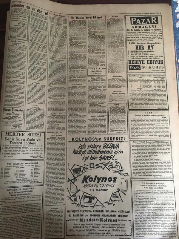 YENİ SABAH GAZETESİ 7AĞUSTOS 1963 YIL :26 SAYI :8763--İdareciler en az 4 yıl vazife görmedikçe değişmeyecek ---Kat mülkiyeti için tasarı hazırlandı ---İzmir yolunda yeni bir kazada 3 kişi daha öldü---Maarif Müdürü Açıkta Talebe Kalmayacak Dedi ---7 Kişilik aileyi sel götürdü --İki kardeş suçu pay edemiyor ---25 Yerde üst mahkeme kuruluyor ---Ardıçoğlu işine karışan olursa çekip gidecek --25 Yerde üst mahkeme kuruluyor ---Daha 18 yaşında iken bir düzine sevgilisi vardı ---Sık sık saate bakmak :Siyavuşgil --Kolombiya da şakiler 45 kişiyi öldürdü --B.Almanya Savunma bütçesi yüzde 40 nisbetinde arttı ---Türk Sinemasında Yeni Filmler Başarılı --Sinemalar : Atlas : Kadının Arzu Ettiği Aşk ,İnci :Zorla Evlendik ,Konak :Büyük Misafir ---Fenerbahçe bu gece Altay ile oynuyor --A ve Ümit Milli Takımının Çalışma Programı Belli Oldu ---Voleybol da bu gece rakibimiz :İsrail --İstanbul a bu sene 16 yabancı tenisçi geliyor --Amerikan Atletleri İngiltere yi de yendi :120-91--- adlı eser, Kitap > Süreli Yayınlar > Gazeteler > Türkiye > Genel > Günlük kategorisinde İkinci El olarak satıştadır.