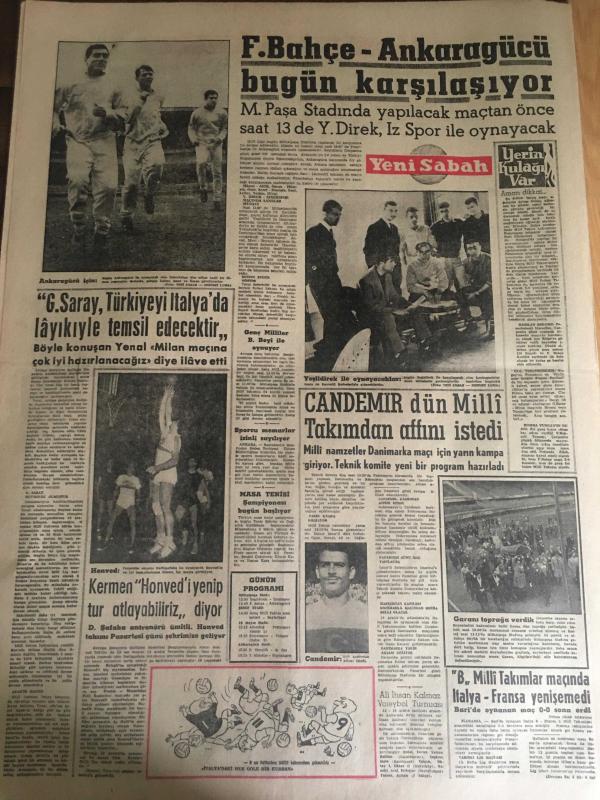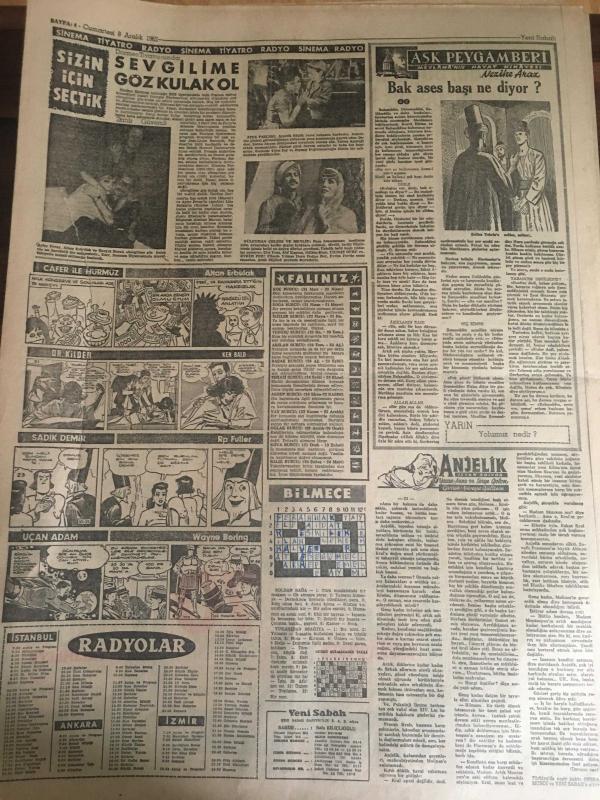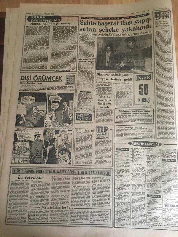 YENİ SABAH GAZETESİ 8 ARALIK 1962 YIL :25 SAYI :8528---N.Erim ve T.Göle 'yi tasvip ettiklerini basına açıklayan :Gülek ve Doğan ihraç ediliyor ---Gülek Partilerin Teftişini İstiyor ----4 CHP 'li bugün müdafaa yapacak---Yeminli teşkilata dair bir açıklama ---Yıkılan duvarın altında kalan 3 kişi ezilip öldü ---Diyarbakır da içinden 111.010 lira olan bir çanta çalındı ---Aman pencereyi açma : Siyavuşgil ---Sahte haşerat ilacı yapıp satan şebeke yakalandı ---Sinemalar : Atlas :Büyük İsyan ,İnci :Ateş Parçası ,Konak :Generalin Aşkı ,Lale :Ali 'kinin Aşkı ----Ayakkabı boyacılarının başvekili :Derviş İsmail --Tiyatro :Sevgilimle Göz Kulak Ol ---Fenerbahçe -Ankaragücü bugün karşılaşıyor ---Galatasaray ,Türkiye 'yi İtalya da layıkıyla temsil edecektir ---Candemir dün Milli Takımdan Affını İstedi ---Kermen Honved 'i yenip tur atlayabiliriz ---B.Milli Takımlar Maçında İtalya -Fransa Yenişemedi ---- Yıpranma, sararmalar, kupon kesiği ve yırtılmalar zamana bağlı olarak görülebilir.
