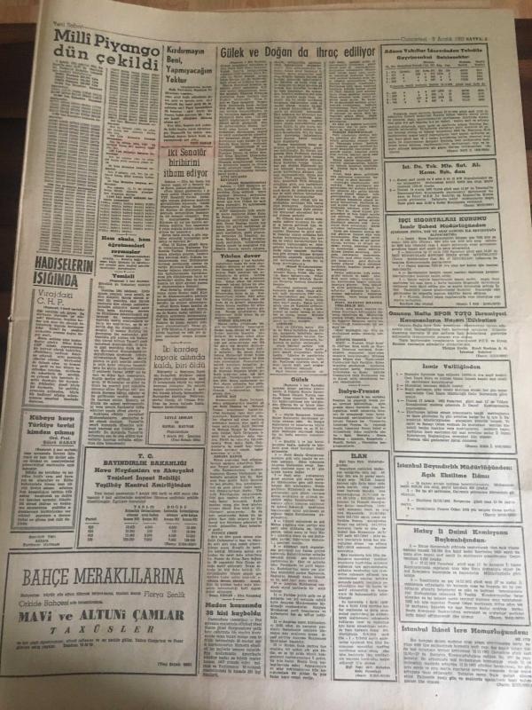 YENİ SABAH GAZETESİ 8 ARALIK 1962 YIL :25 SAYI :8528---N.Erim ve T.Göle 'yi tasvip ettiklerini basına açıklayan :Gülek ve Doğan ihraç ediliyor ---Gülek Partilerin Teftişini İstiyor ----4 CHP 'li bugün müdafaa yapacak---Yeminli teşkilata dair bir açıklama ---Yıkılan duvarın altında kalan 3 kişi ezilip öldü ---Diyarbakır da içinden 111.010 lira olan bir çanta çalındı ---Aman pencereyi açma : Siyavuşgil ---Sahte haşerat ilacı yapıp satan şebeke yakalandı ---Sinemalar : Atlas :Büyük İsyan ,İnci :Ateş Parçası ,Konak :Generalin Aşkı ,Lale :Ali 'kinin Aşkı ----Ayakkabı boyacılarının başvekili :Derviş İsmail --Tiyatro :Sevgilimle Göz Kulak Ol ---Fenerbahçe -Ankaragücü bugün karşılaşıyor ---Galatasaray ,Türkiye 'yi İtalya da layıkıyla temsil edecektir ---Candemir dün Milli Takımdan Affını İstedi ---Kermen Honved 'i yenip tur atlayabiliriz ---B.Milli Takımlar Maçında İtalya -Fransa Yenişemedi ---- adlı eser, Kitap > Süreli Yayınlar > Gazeteler > Türkiye > Genel > Günlük kategorisinde İkinci El olarak satıştadır.
