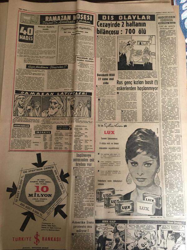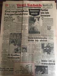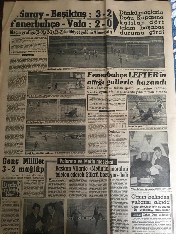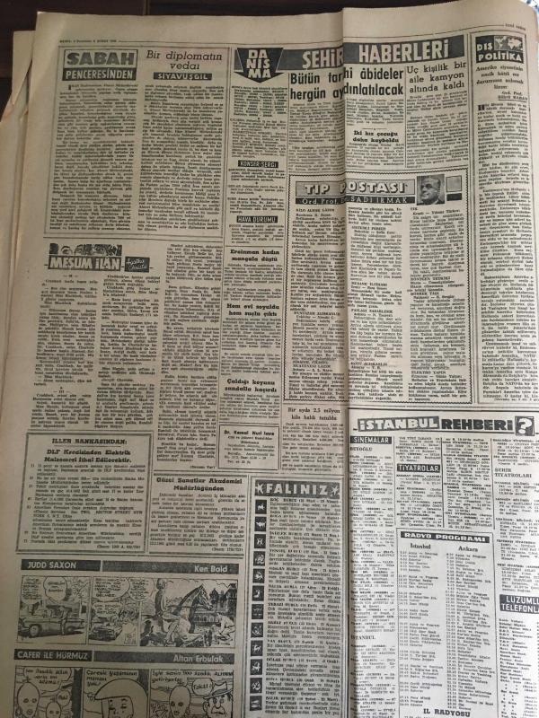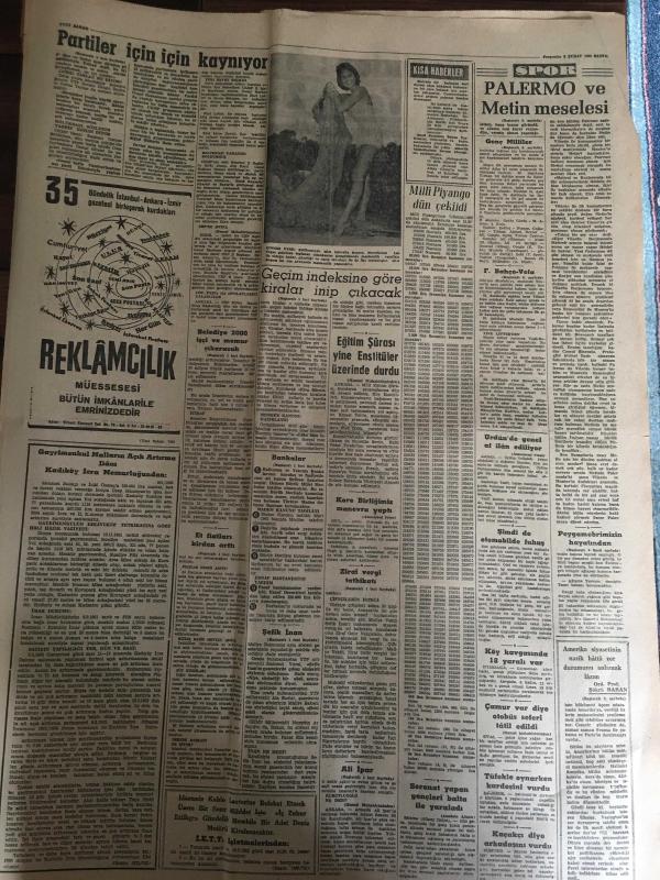 YENİ SABAH GAZETESİ 8 ŞUBAT 1962 YIL :24 SAYI :8230--Zirai vergi tatbikatı 3 ay geri bırakılıyor ---Şefik İnan kendi sözünü beğenmedi --Partiler için için kaynıyor --Geçim indeksine göre kiralar inip çıkacak ---Ali Ipar tahliye edildi --Et fiyatları birden arttı --Karnında pens kalan kadın davayı kazandı ---Belediye 2.000 işçi ve memur çıkacak --Bir diplomatın vedası :Siyavuşgil ---Tiyatrolar ,Radyo Programları ---Dış Olaylar : Cezayir de 2 haftanın bilançosu :700 ölü --Rus genci kızları basit askerlerden hoşlanmıyor ---Eğitim Şürası yine Enstitüler üzerinde durdu --Galatasaray -Beşiktaş :3-2 --Fenerbahçe -Vefa :2-0----Fenerbahçe Lefter in attığı gollerle kazandı ---Genç Milliler 3-2 Mağlup ---Canın belinden yukarısı alçıda --Gürsel ,Sunay ile görüştü --Ekmek 5 kuruş daha ucuzluyor --Bakanlar 3 ayda bir tüccarla görüşecek ---Üç avcı çığ altında öldü -- Yıpranma, sararmalar, kupon kesiği ve yırtılmalar zamana bağlı olarak görülebilir.