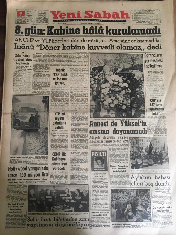 YENİ SABAH GAZETESİ 9 KASIM 1961 YIL :24 SAYI :8139---8 gün :Kabine hala kurulamadı --İnönü Döner kabine kuvvetli olamaz dedi ---İnönü CHP hakkı ne ise onu istiyor ---YTP iyi niyetli olduğunu belirtti ---Öğrencilerin yer meseleleri hallediliyor ---CHP 'nin 147 'lerle ilgili kanun teklifi ----Annesi de Yüksel ' in acısını dayanamadı --CKMP ilk kabineye güven oyu verecek ---Hollywood yangınında zarar 150 milyon lira ---Ayla 'nın babası elleri boş döndü ---Şehir hattı biletlerine zam yapılması düşünülüyor ---Tek çıkar yol :Siyavuşgil --Sahte ilaç imal eden bir şebeke yakalandı ---Atom a karşı sığınak ---İran da bir komünist şebekesi yakalandı --Mahkumlar açlık grevi yapacakmış ---Sinemalar ,Tiyatrolar ,Radyo Programları ---Milli Takım Dün Sadece Gol Attı :7-1---Rus Milli Takımı bugün geliyor ---Teknik Komite Tereddüt Ediyor ---Can maçta sakatlandı ---Kaçalin de Rus forvet hattından şikayetçi --Üç Çocuk Daha Kayboldu ---Eski MBK üyeleri dün toplandı --- Yıpranma, sararmalar, kupon kesiği ve yırtılmalar zamana bağlı olarak görülebilir.
